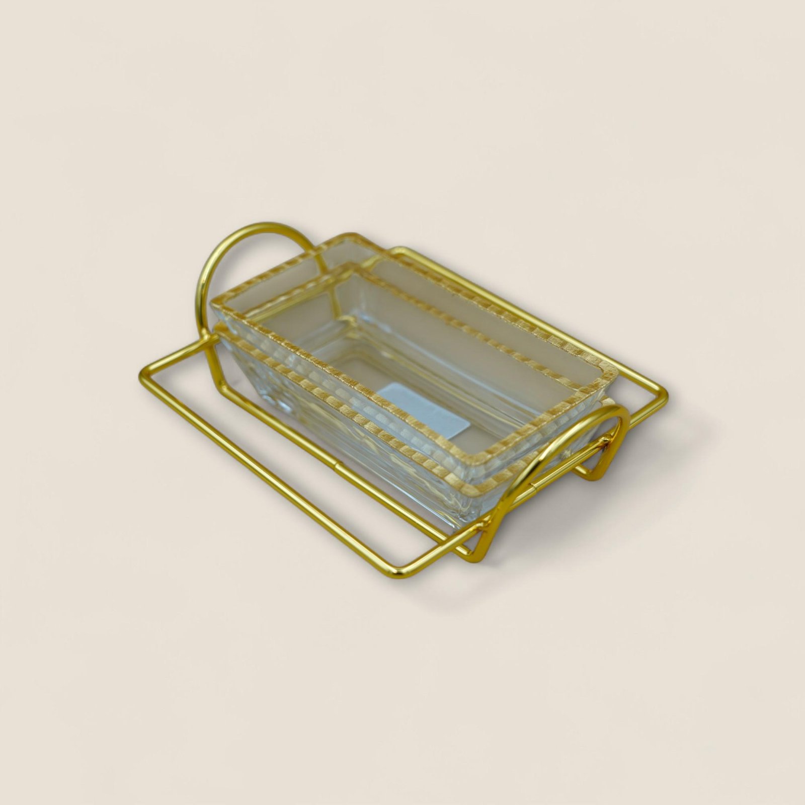 | Features | Dimensions: 16.5x3.5x13.5 cm - Set Includes:-2x Rectangular glass dishes with a refined gold trim-1x Metal holder rack in a modern matte gold finish |