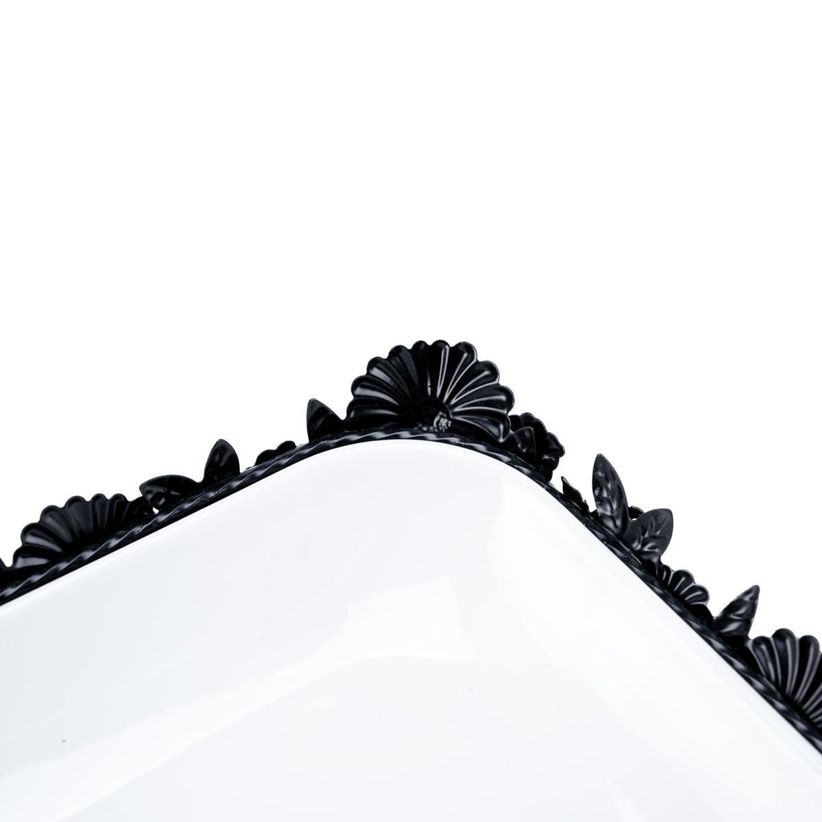 Serving tray is crafted with an ornate black metal frame featuring a charming floral design. The sleek white glass surface adds a modern contrast, making it perfect for serving appetizers, desserts, or decorative displays. Its sturdy legs ensure stability, while the elegant craftsmanship enhances any dining table, coffee setup, or special event.