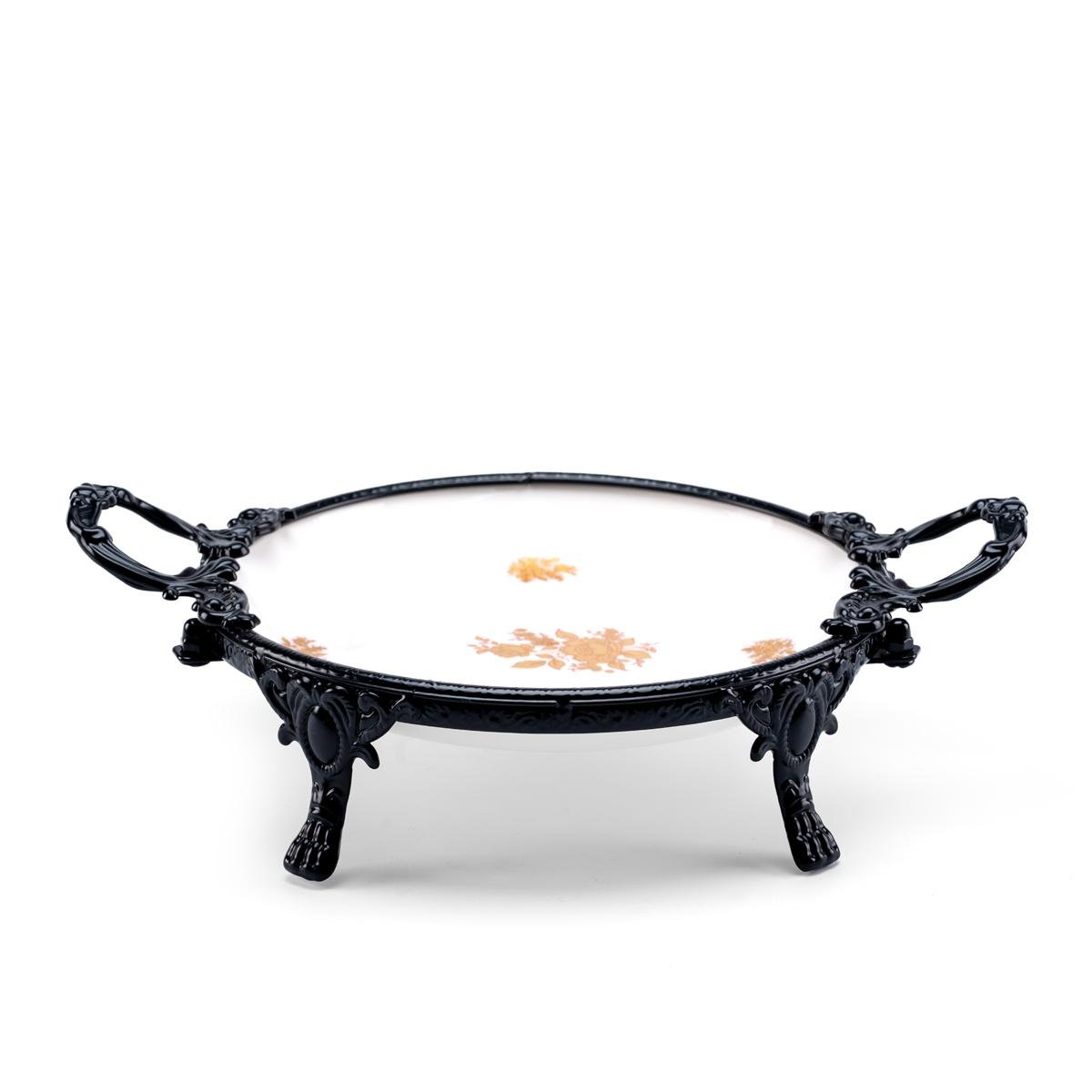 Serving tray is designed with a luxurious black metal frame and elegant gold floral detailing on a smooth white glass base. The ornate handles provide a refined touch while ensuring easy handling, making it perfect for serving fruits, desserts, or snacks in style. Supported by sturdy, decorative legs, this bowl offers a stable and elevated presentation, blending classic elegance with modern sophistication.