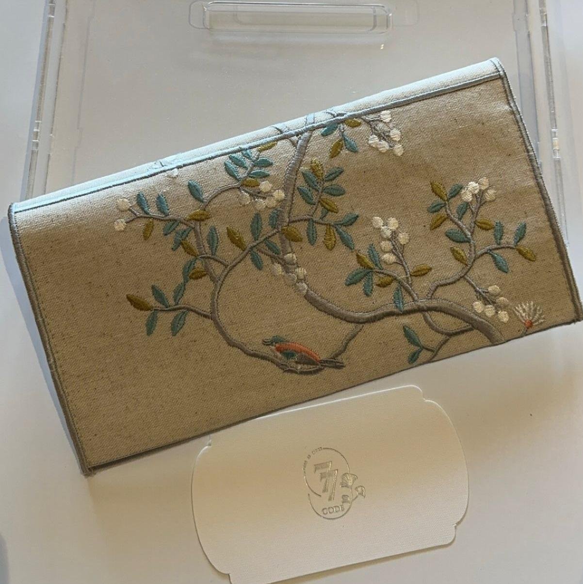 The Embroidered Fabric Envelope – Branch & Bird Garden Motif. Crafted from high-quality fabric, this exquisite envelope features intricate embroidery of delicate branches and birds, evoking a serene garden scene. The timeless design blends elegance with functionality, making it perfect for storing letters, jewelry, gift cards, or cherished mementos.