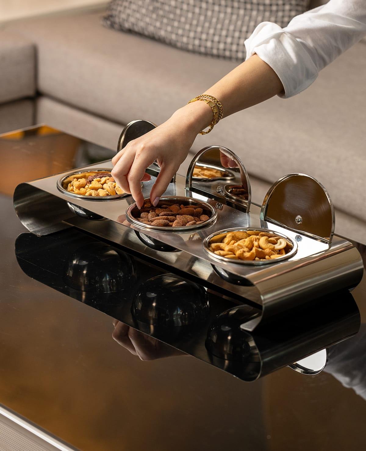 This beautifully crafted Indian Nut Bowl with Lid and Base blends traditional design with everyday functionality. Whether you're serving nuts, sweets, dates, or small snacks, this bowl keeps everything covered and stylishly presented. The intricate patterns and smooth finish give it a rich, artisanal feel that elevates any table setup—perfect for gatherings, Ramadan iftar, or cozy evenings with guests.
