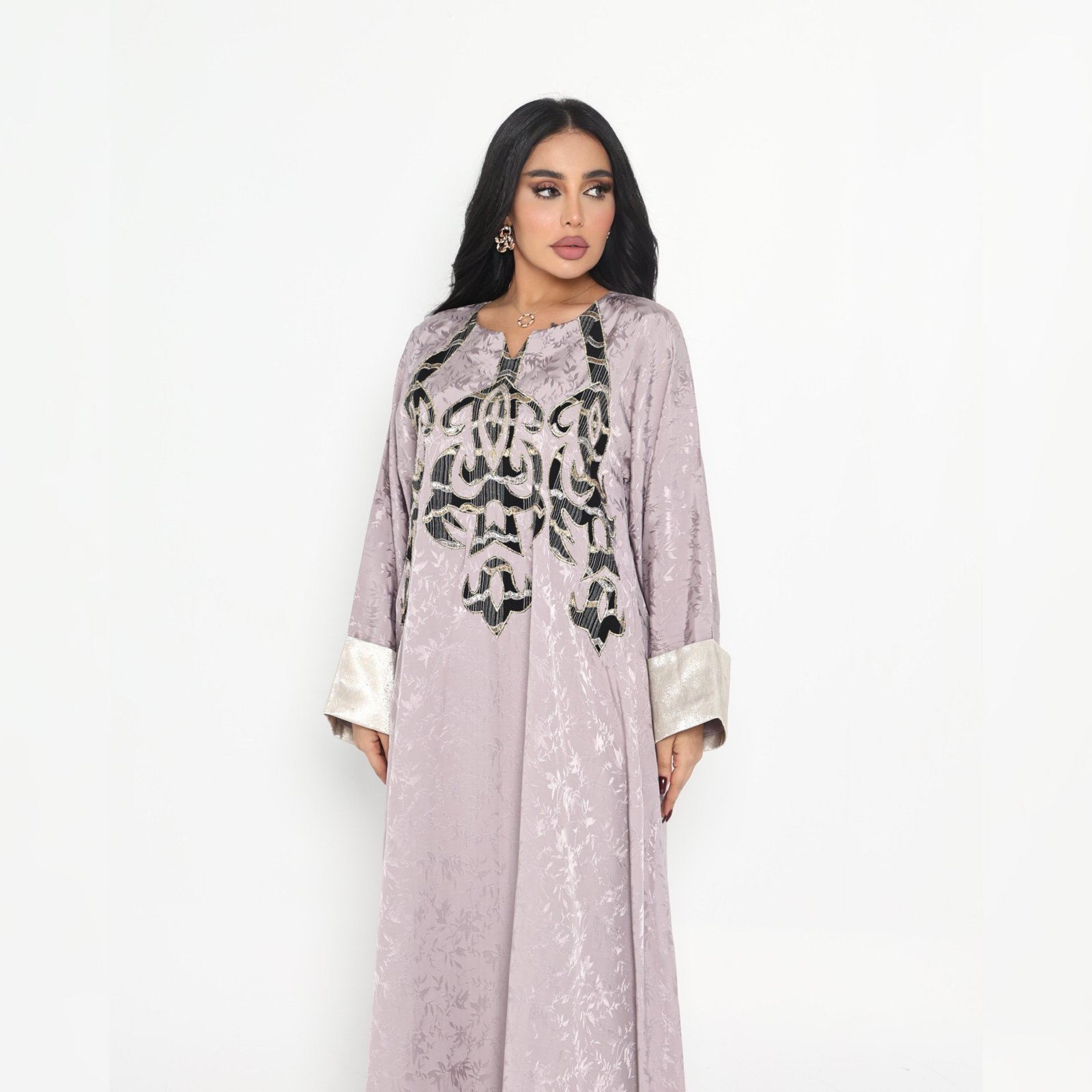 This piece will be a wardrobe staple. Elegance with a touch of elegance with this purple kaftan embroidered with metallic touches and satin sleeves