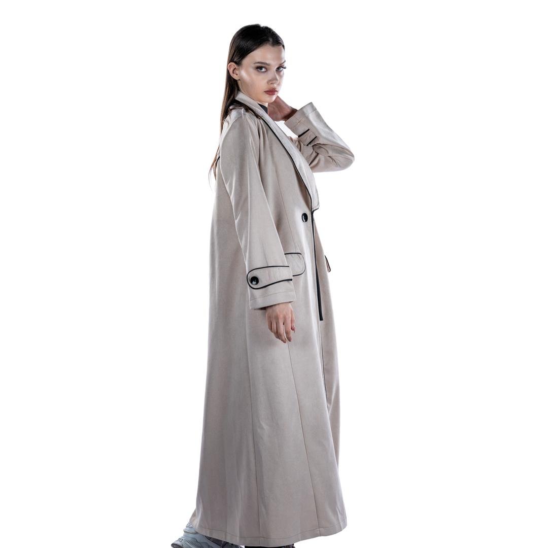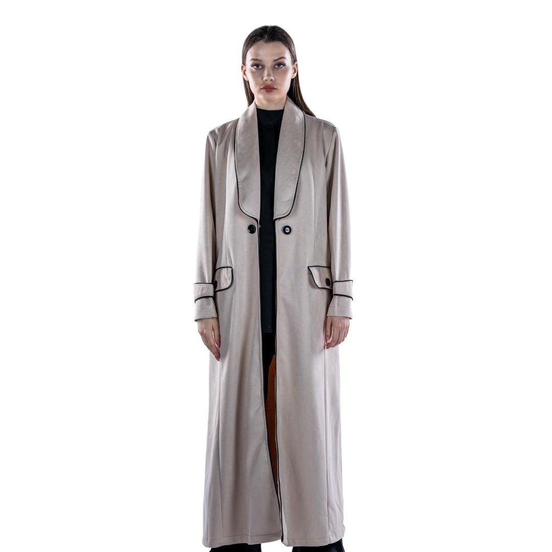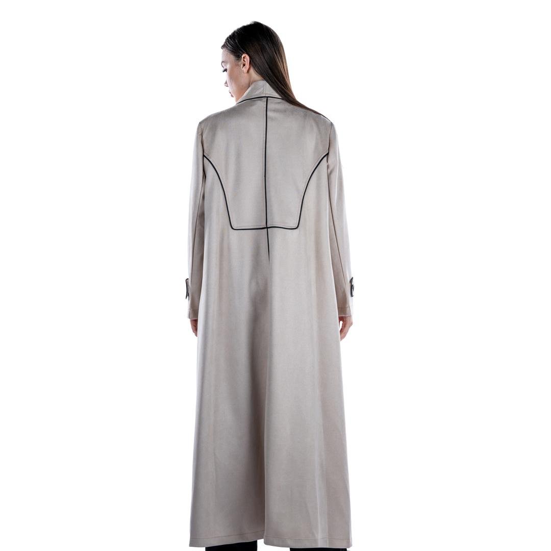 This coat is featuring elegant black piping along the lapels, cuffs, and pockets, this trench coat combines classic design with modern flair. Made from high-quality materials, it offers both comfort and durability, making it a perfect addition to your wardrobe for any season. The coat's sleek silhouette and timeless color make it a versatile piece that can be dressed up or down.