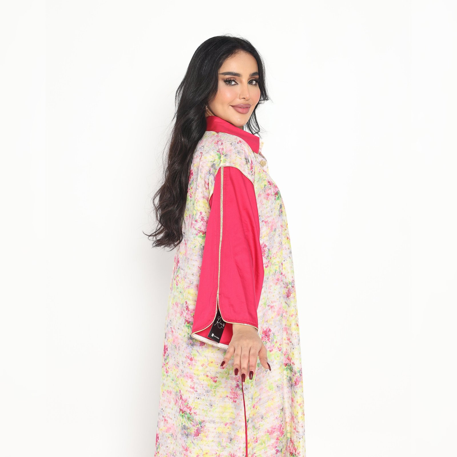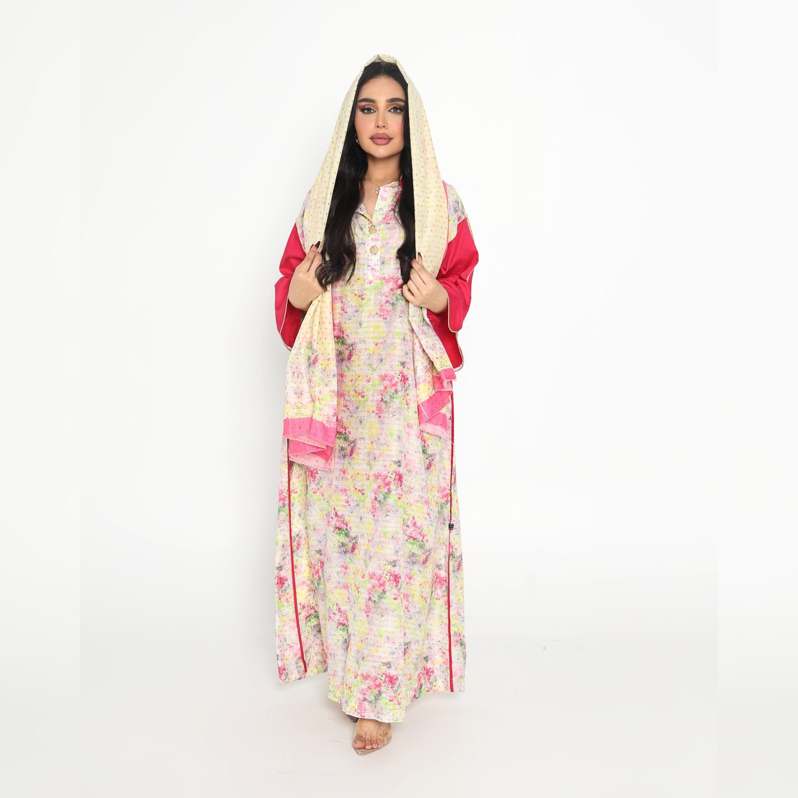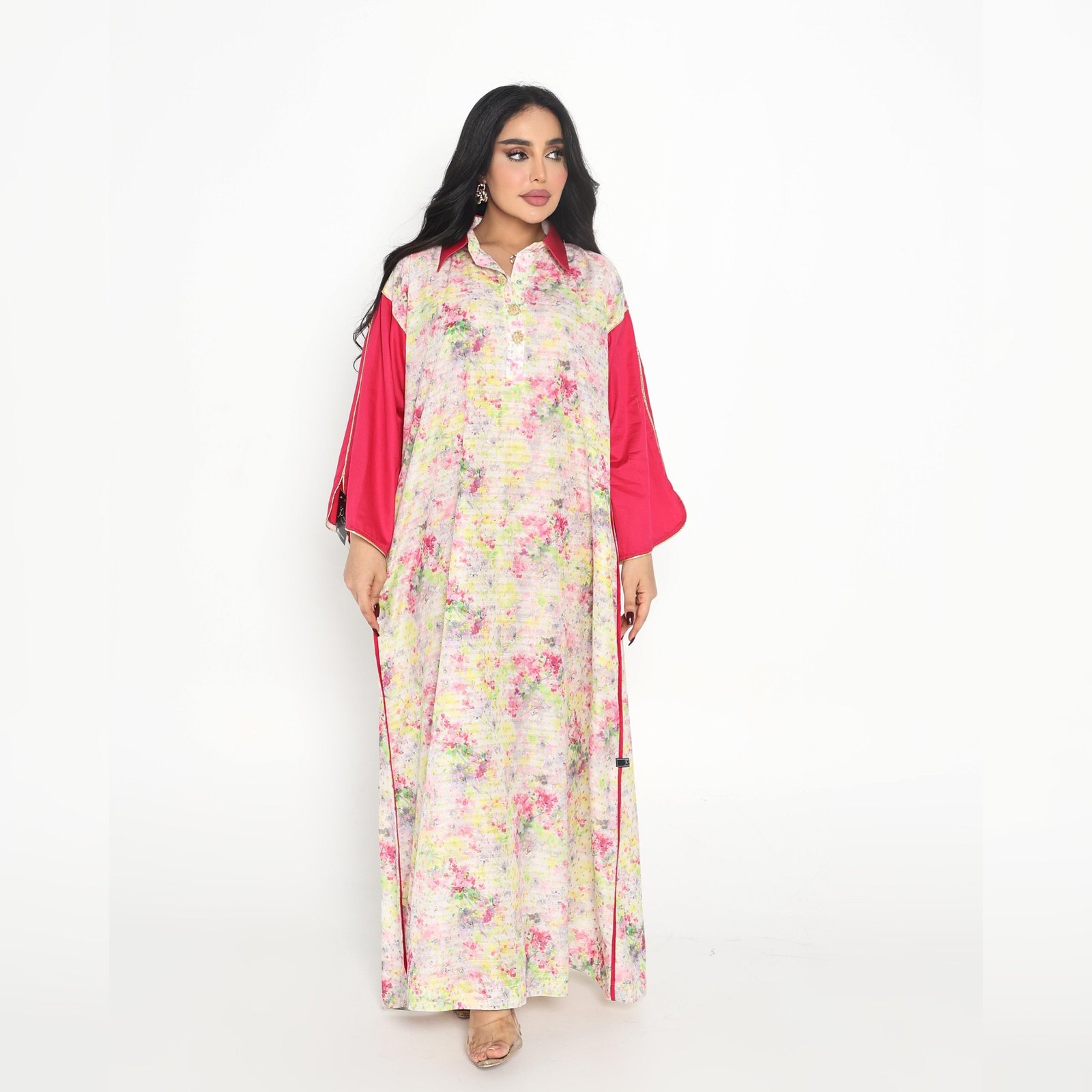 Experience the elegance that will make you go out again with the Rosie Radiance Kaftan in an abstract pastel floral print with sleeves and a collar in a bold cherry red color