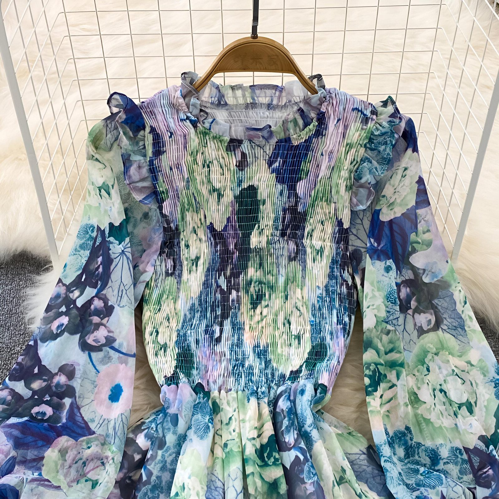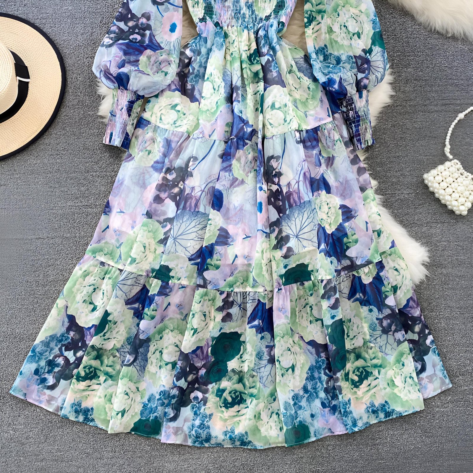 A clean look with a classic touch. This floral maxi dress with a ruffled neckline and layered hem combines comfort and elegance, making it the perfect choice for any occasion. The draped neckline adds a romantic touch, while the tiered detailing gives you beautiful movement with every step. Made from a light and soft fabric, it's perfect for a daytime outing or an evening by the beach.