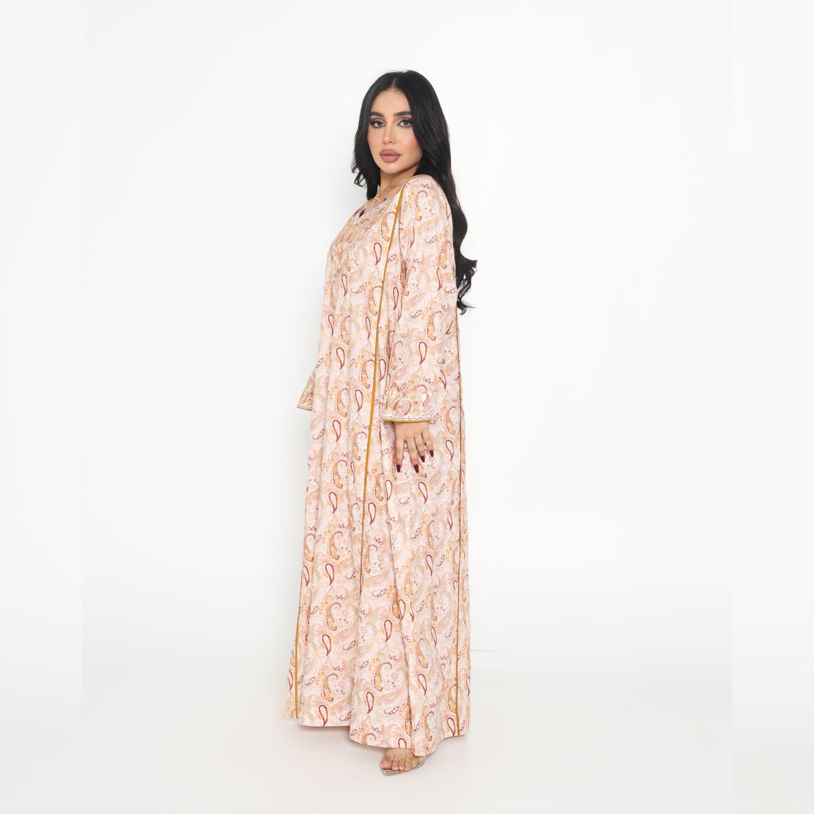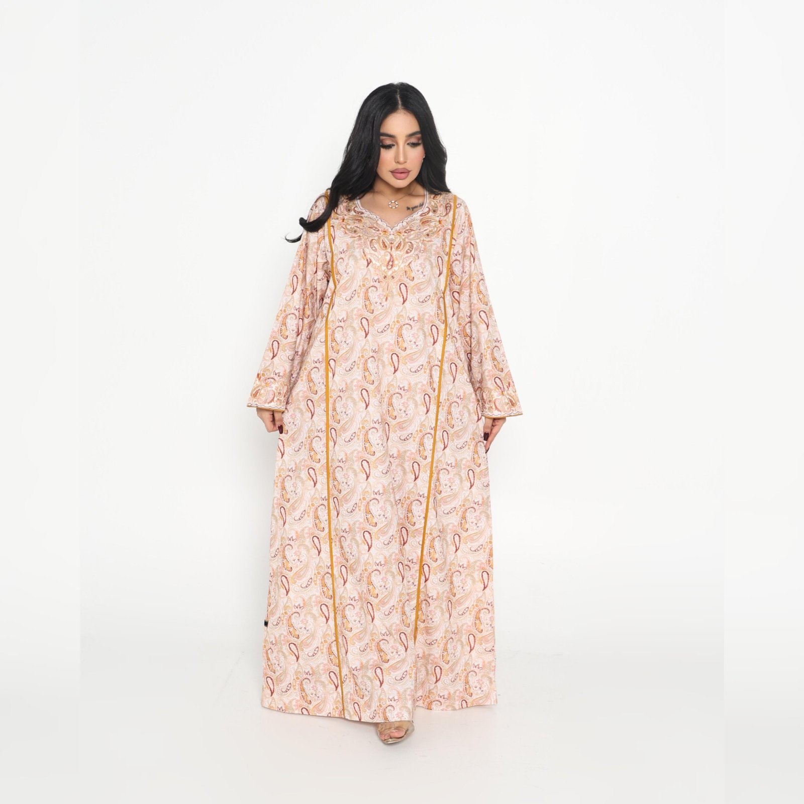 Comfort and elegance in one piece with this light pink paisley print kaftan.
