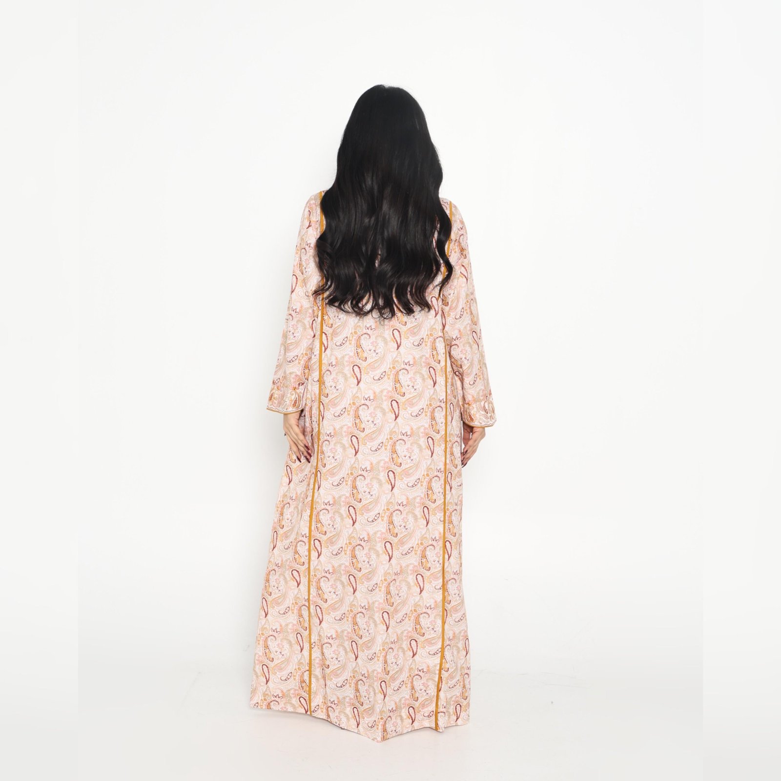 Shine in comfort and elegance with this light pink kaftan featuring a paisley print and mustard gold piping. A relaxed, flowing design with a feminine appeal, it's accented with delicate embroidery at the sleeves for a simple, luxurious touch. Perfect for lounging around the house or welcoming guests with a sophisticated look.