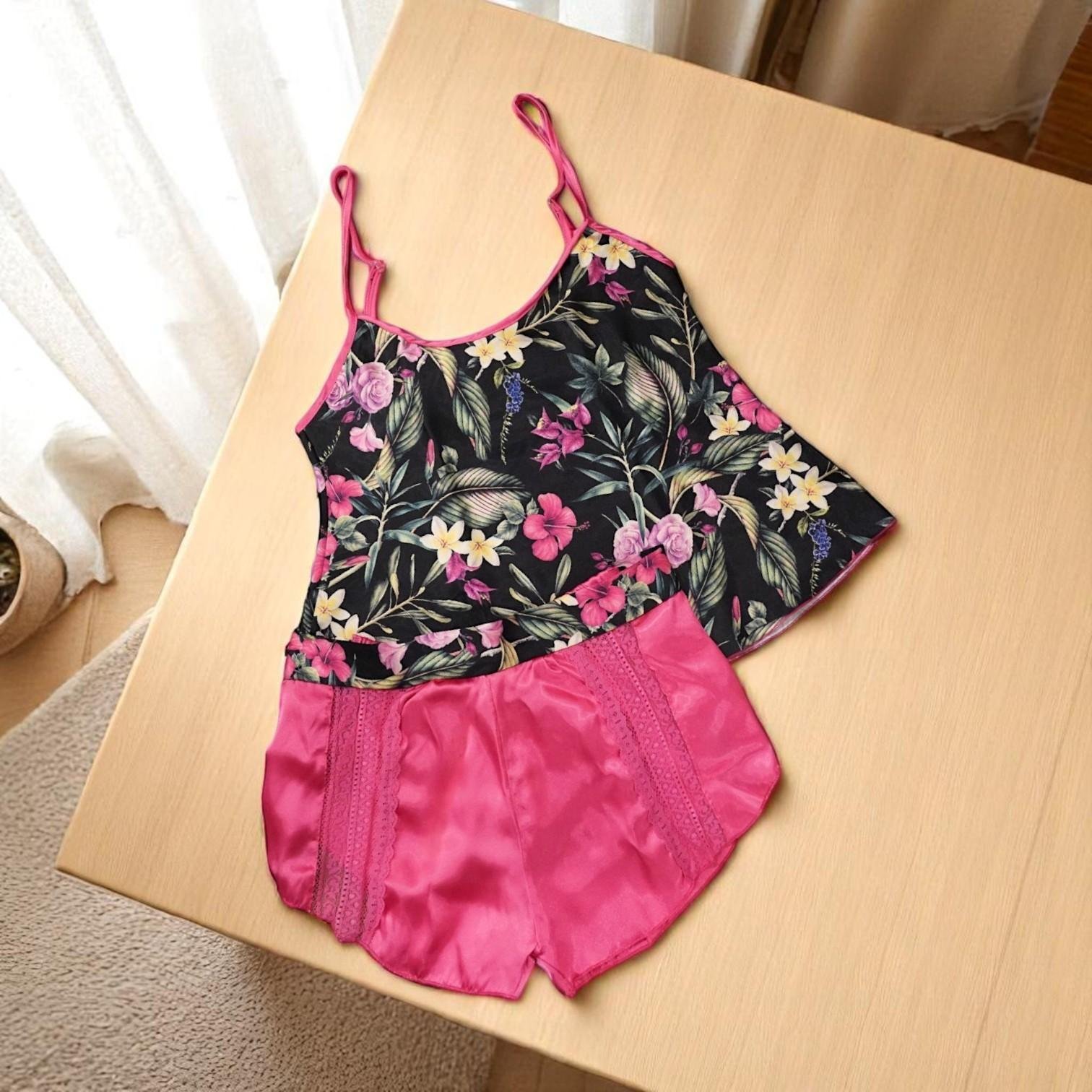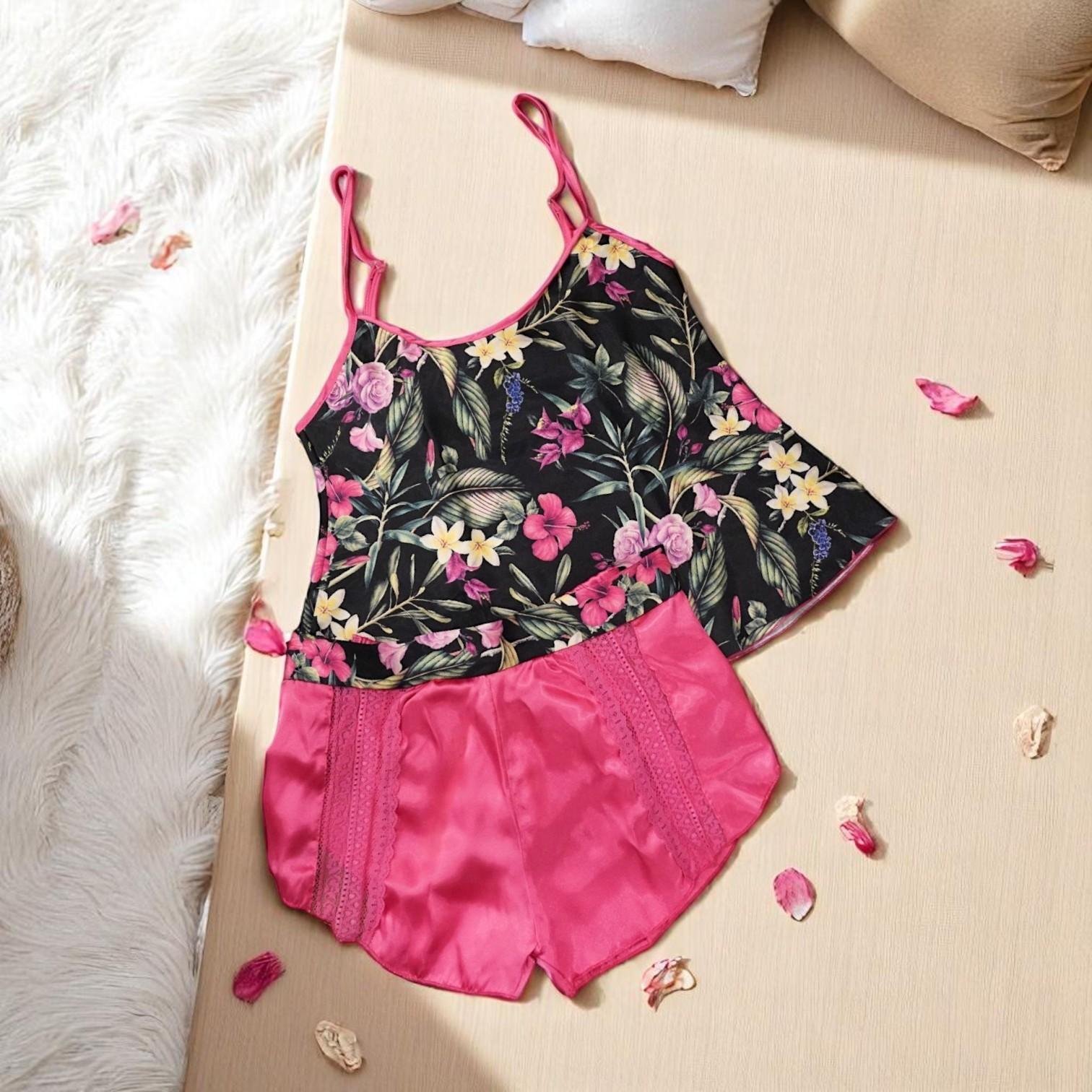 If you are looking for a sense of luxury even while sleeping, this set is for you with VIP Women's Floral Satin Nightwear Set - Black Tropical Print Cami and Hot Pink Lace Shorts