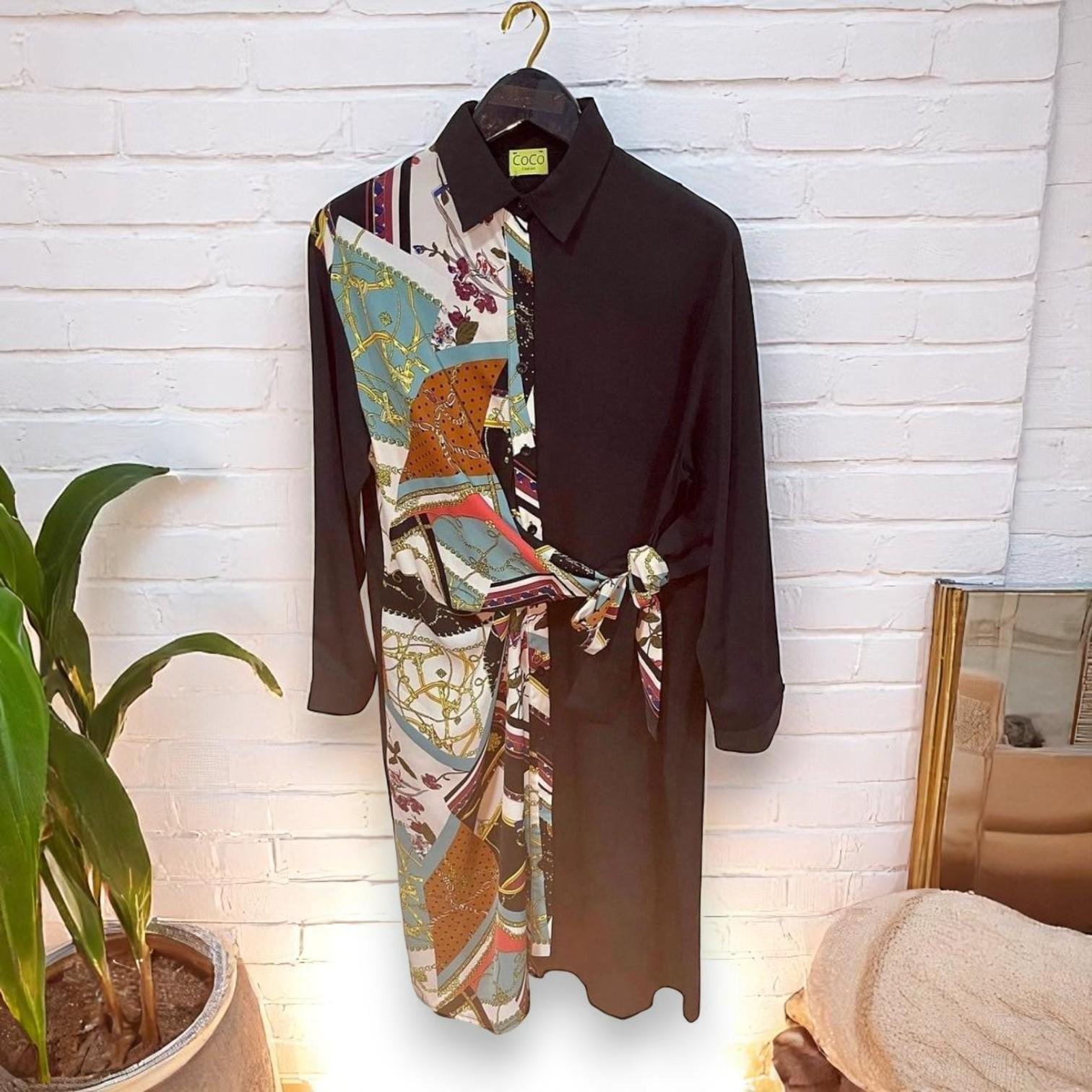 A women's belted shirt with mixed prints. This design combines bold patterns and solid colors, giving you a distinctive look suitable for various occasions. The adjustable belt accentuates the waist, while the classic cut offers comfort and elegance at the same time.