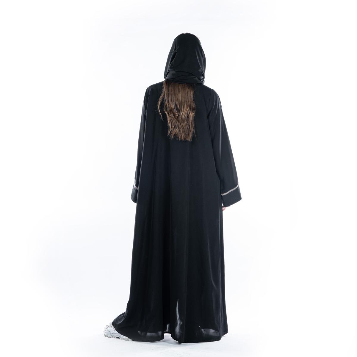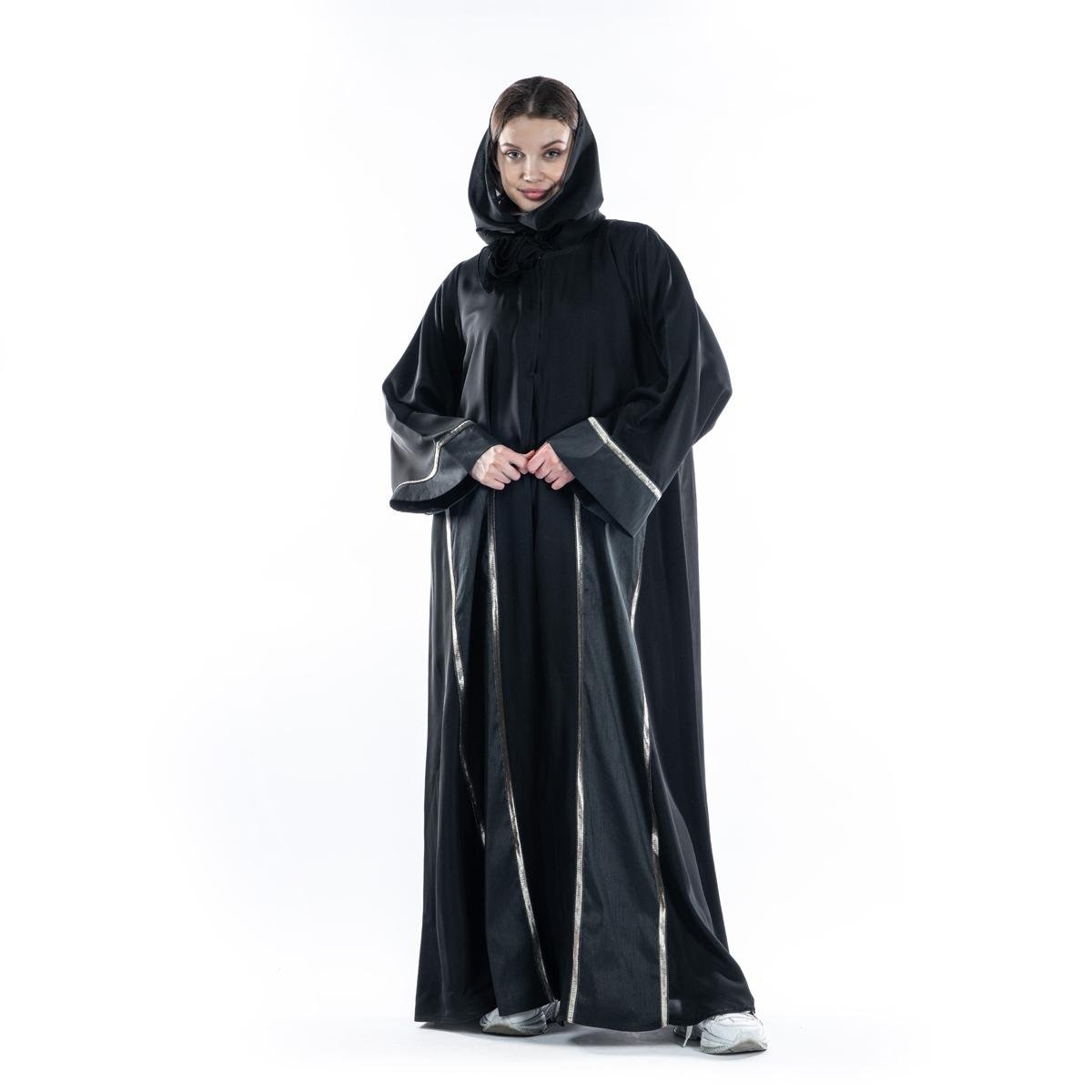 عباية تجمع بين الرقي والبساطة بتفاصيل تبرز أناقتك في كل مناسبة مصنوعة من قماش ناعم وعالي الجودة، وتتميز بألواح مخملية فاخرة مزينة بحواف معدنية ناعمة تضيف لمسة لامعة راقية. الجيوب الخارجية توفر راحة عملية، ومع الطرحة المطابقة ستحصلين على طقم متكامل يليق بكل الأوقات.