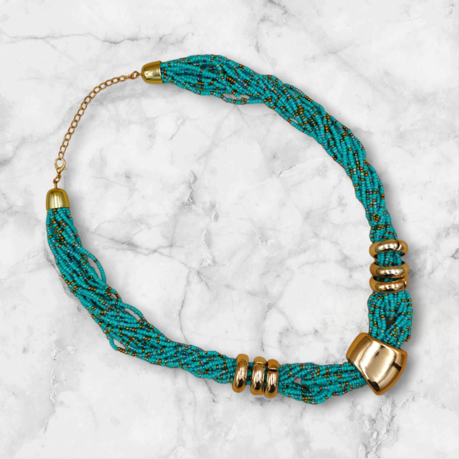 هذا العقد مصمم يدويًا بتفاصيل مميزة وطبيعية، باستخدام بذور خرز تركوازية زاهية، مع تفاصيل معدنية ذهبية تضفي لمسة من الفخامة والتباين. تصميم الجديلة يضيف بعدًا وملمسًا مميزًا، مما يجعله قطعة لافتة للإطلالات اليومية أو الرسمية. سواء كنتِ ترتدينها للمناسبات أو لتضفي لمسة من الألوان على إطلالتك اليومية.