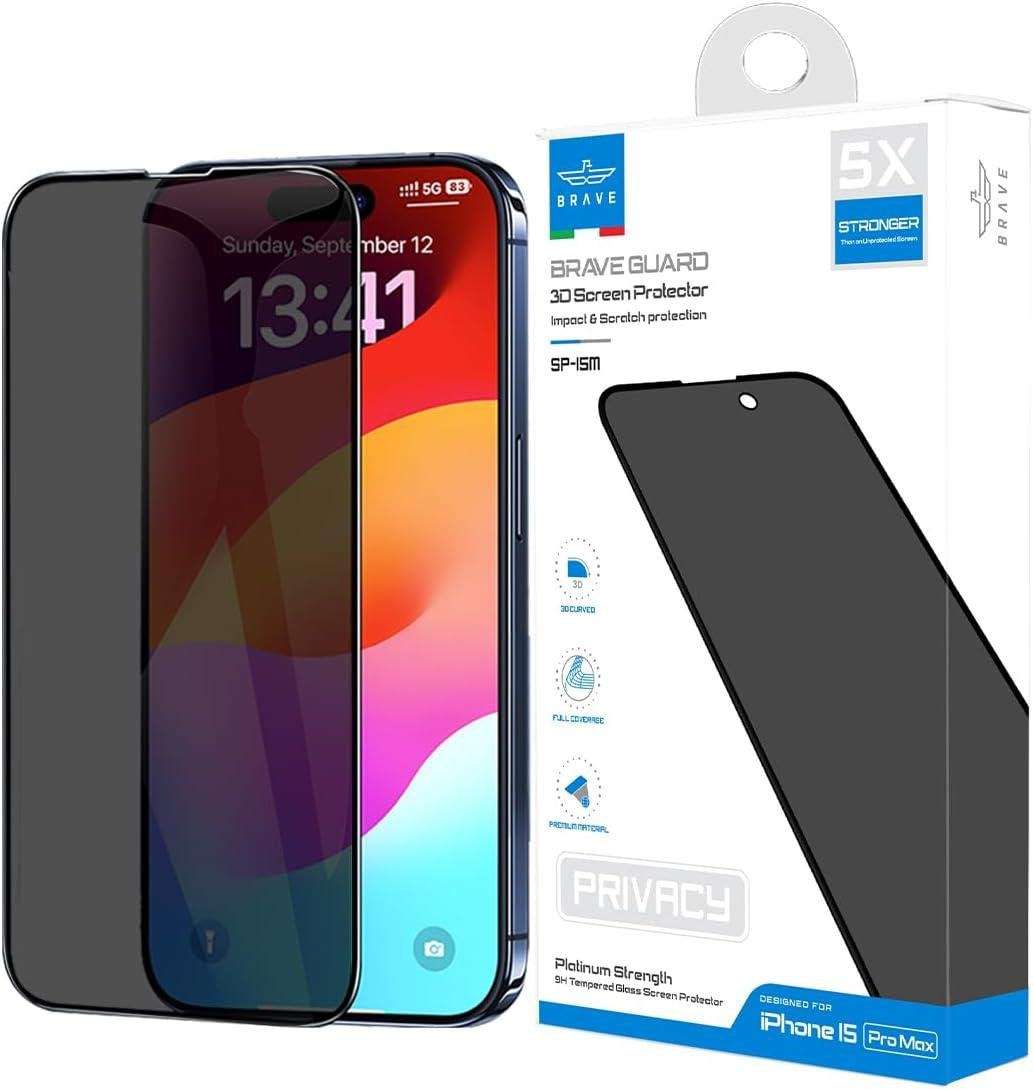 احمِ جهاز iPhone 15 Pro Max الخاص بك مع حامي الشاشة Brave Guard ثلاثي الأبعاد. يوفر هذا الحامي الفاخر حماية لا مثيل لها من الصدمات والخدوش مع الحفاظ على خصوصيتك. مصمم بتقنية متقدمة، يضمن بقاء شاشتك واضحة وآمنة.