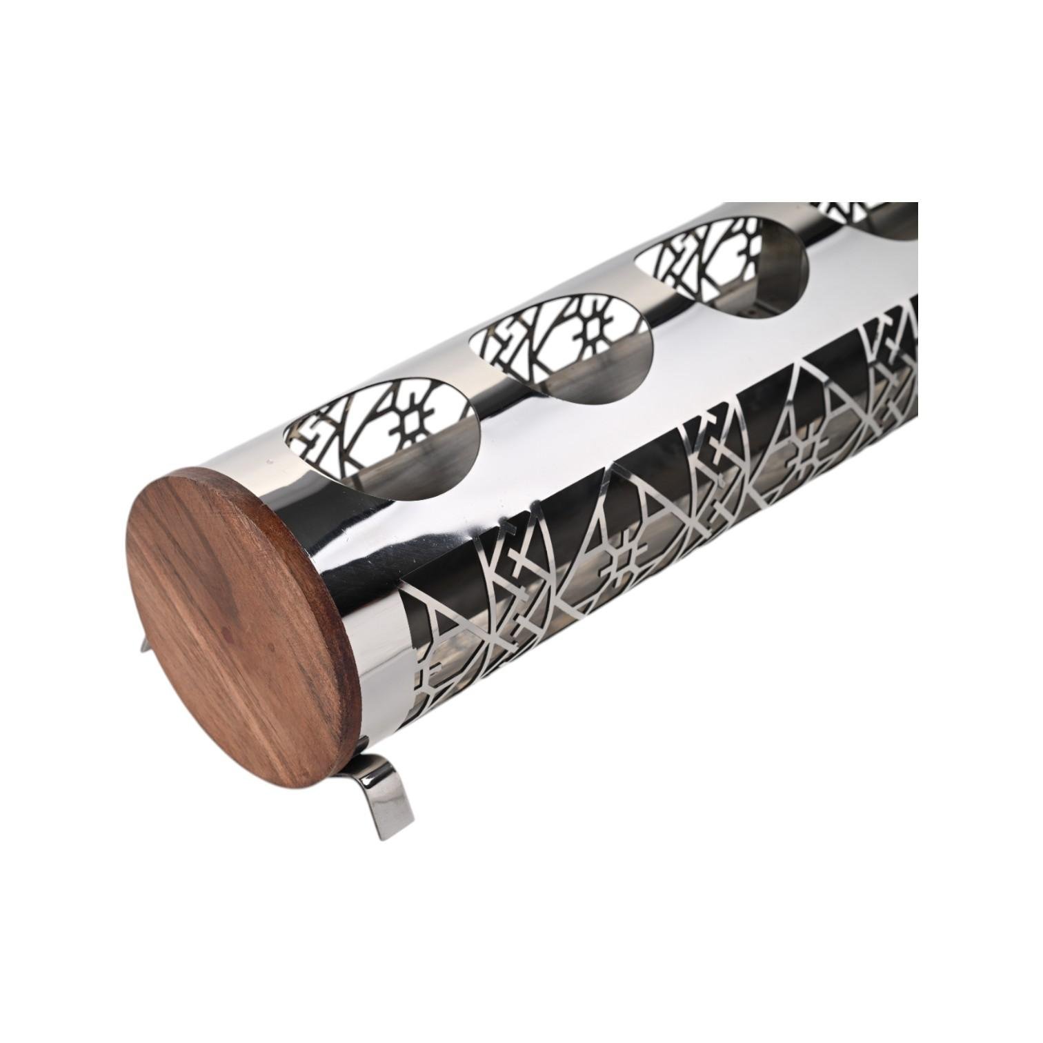 زيني مطبخك بأناقة مع رف عصائر يجمع بين العصرية والفن مع رف عصائر أسطواني من الفولاذ بسعة 5 زجاجات مع تصميم هندسي بالليزر