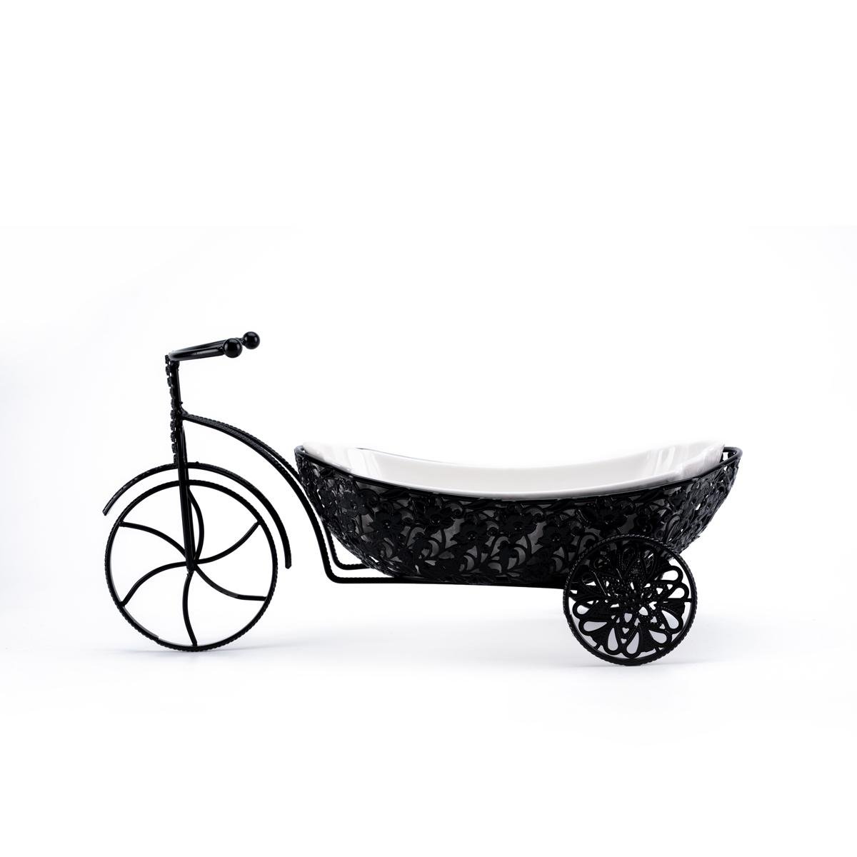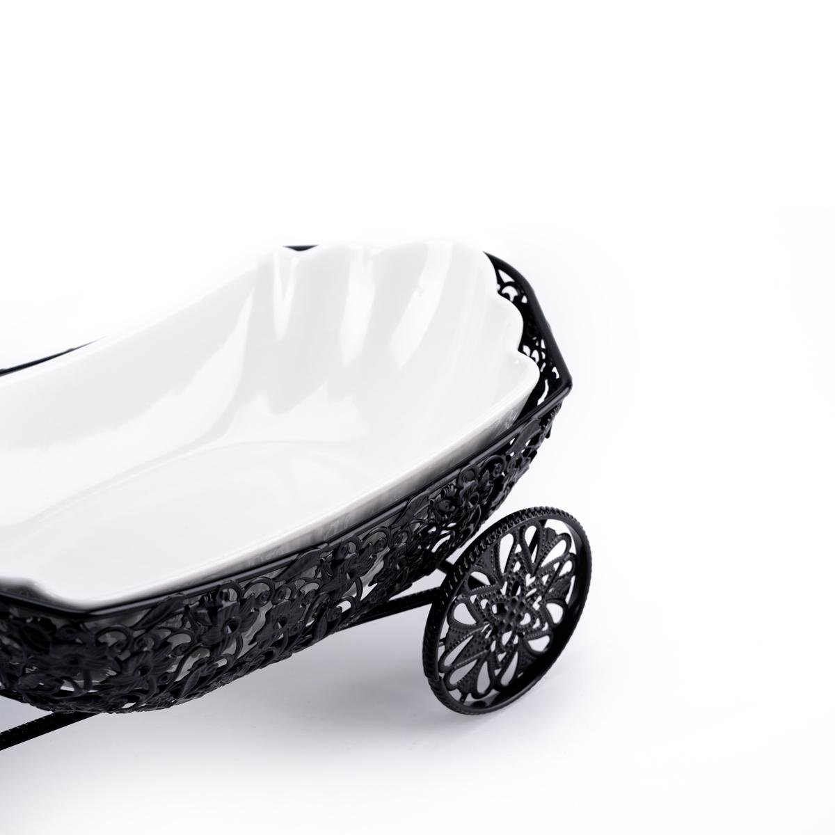تجمع هذه الصينية بين الوظيفة والجمال بتصميم فريد، حيث تأتي بوعاء بورسلين عميق ومثالي لحفظ الفواكه، الوجبات الخفيفة، أو الإكسسوارات الزخرفية. توفر القاعدة الحديدية السوداء بتصميم العربة ثباتًا قويًا وتضفي لمسة راقية على الديكور