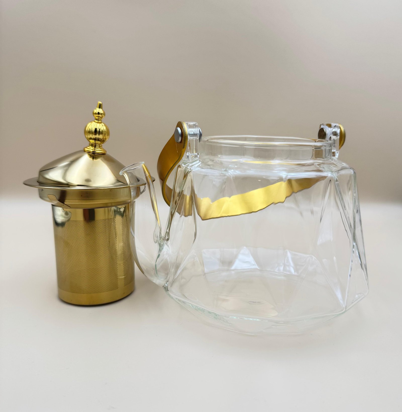لعشاق الشاي هذا الإبريق مصمم لك بكل تفاصيله مع إبريق شاي زجاجي بتصميم ماسي وغطاء ذهبي مع مصفاة ومقبض مزخرف