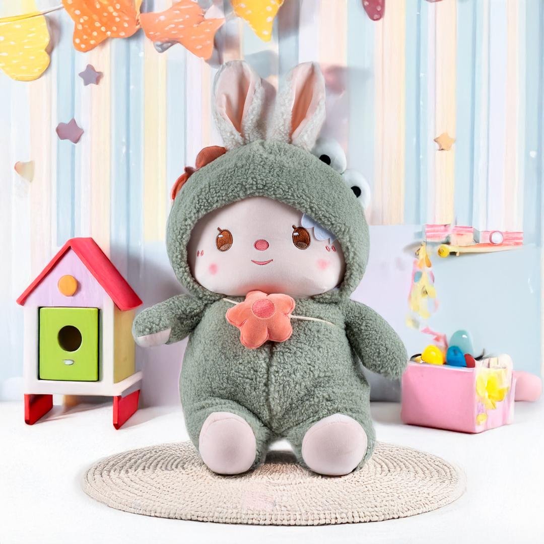 تأتي هذه الدمية المميزة بتصميم فريد يجمع بين شكل الأرنب اللطيف وزي الضفدع المضحك، مما يجعلها خيارًا رائعًا للأطفال ومحبي الدمى المحشوة. أذنا الأرنب الطويلتان وغطاء الرأس بتصميم ضفدع يضيفان لمسة مرحة ومحببة. مثالية كرفيق للنوم، زينة لغرفة الأطفال، أو كهدية تترك أثرًا سعيدًا.
