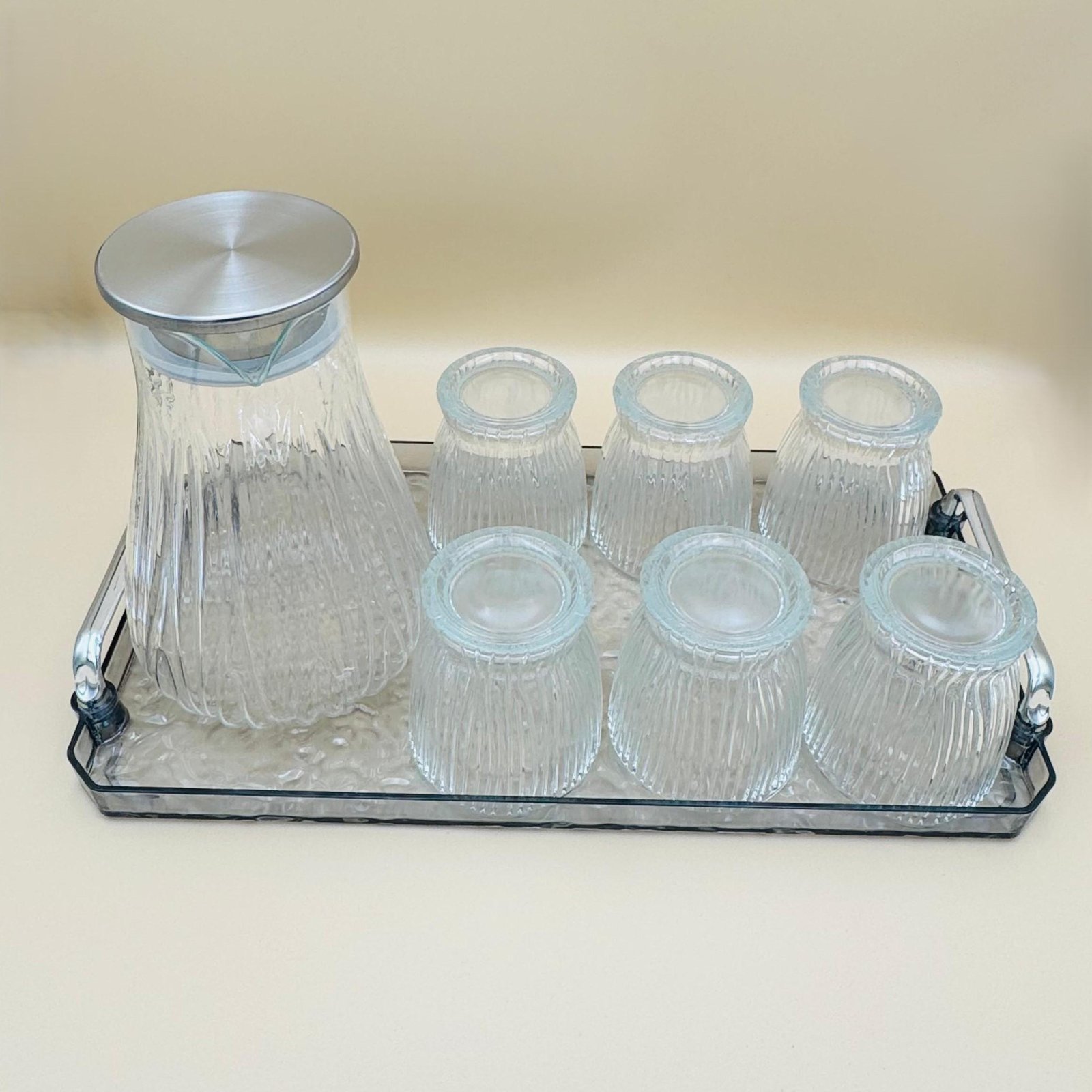أضيفي لمسة من الأناقة إلى مائدتك مع هذه المجموعة الزجاجية المصممة للجمال . تشتمل المجموعة على إبريق أنيق، ستة أكواب مطابقة، وصينية تقديم متعددة الاستخدامات، مثالية لتقديم المشروبات المنعشة في العزومات العائلية، التجمعات، أو حتى أوقات الاسترخاء