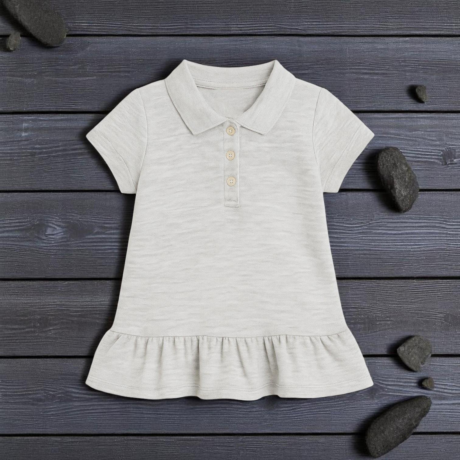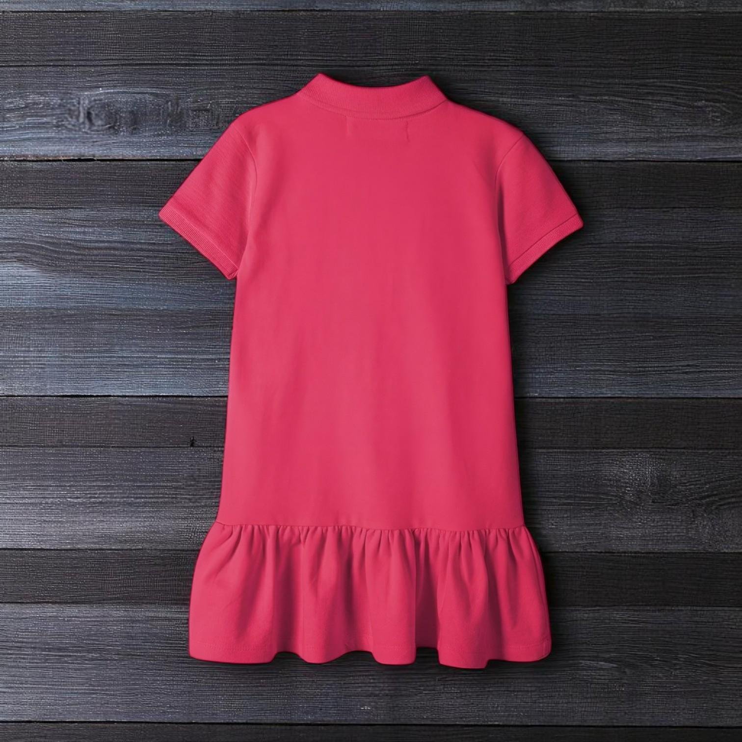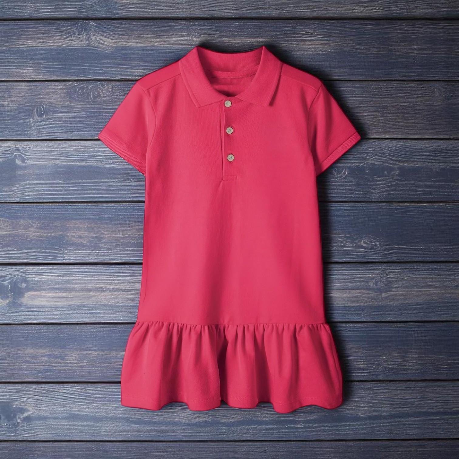 فستان بولو بناتي مع حافة مكشكشة. يتميز هذا الفستان بتصميم رياضي مع ياقة بولو وزرارين أماميين، مع قماش محاك بنقشة خفيفة وقصة خصر منخفض تنتهي بكشكشة أنثوية مبهجة. يمنح طفلتك راحة طوال اليوم وسهولة في الحركة.