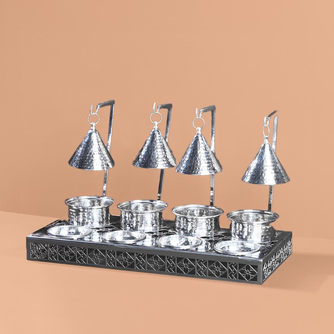 ابدئي صباحك بتنظيم مثالي مع طقم تقديم الإفطار المصمم بقطع ليزر، والذي يحتوي على 4 أوعية مخصصة للأطعمة الساخنة و4 للأطعمة الجافة، موضوعة على قاعدة خشبية أنيقة تضيف لمسة جمالية لأي طاولة.