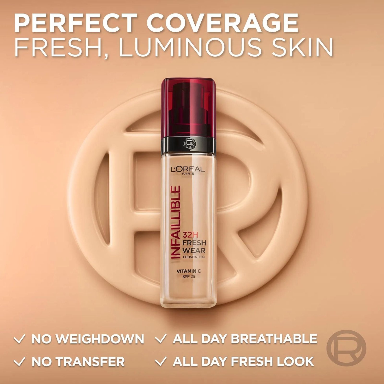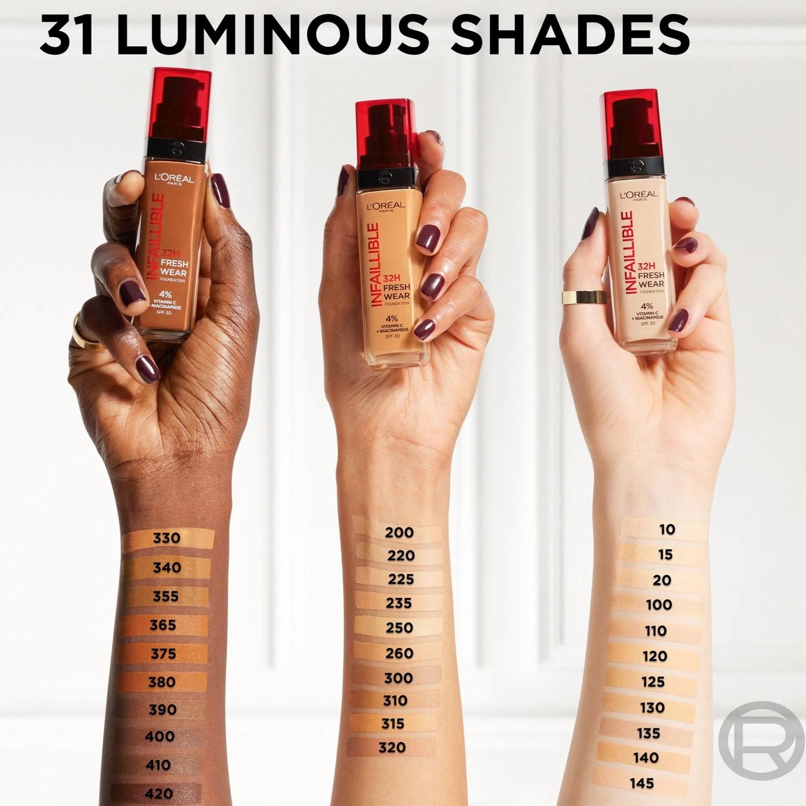 كريم الأساس لوريال باريس إنفاليبل 24 ساعة بدرجة ناتشورال روز 125 يمنحك تغطية كاملة بمظهر طبيعي وإحساس خفيف. يدوم حتى 24 ساعة دون أن يتأثر بالحرارة أو الرطوبة أو التعرق، ما يجعله مثاليا لأيام العمل الطويلة أو الخروج في المساء. الدرجة الوردية الطبيعية تندمج بسهولة مع البشرة لتعطي لمسة نهائية مطفية ومشرقة في آن واحد.