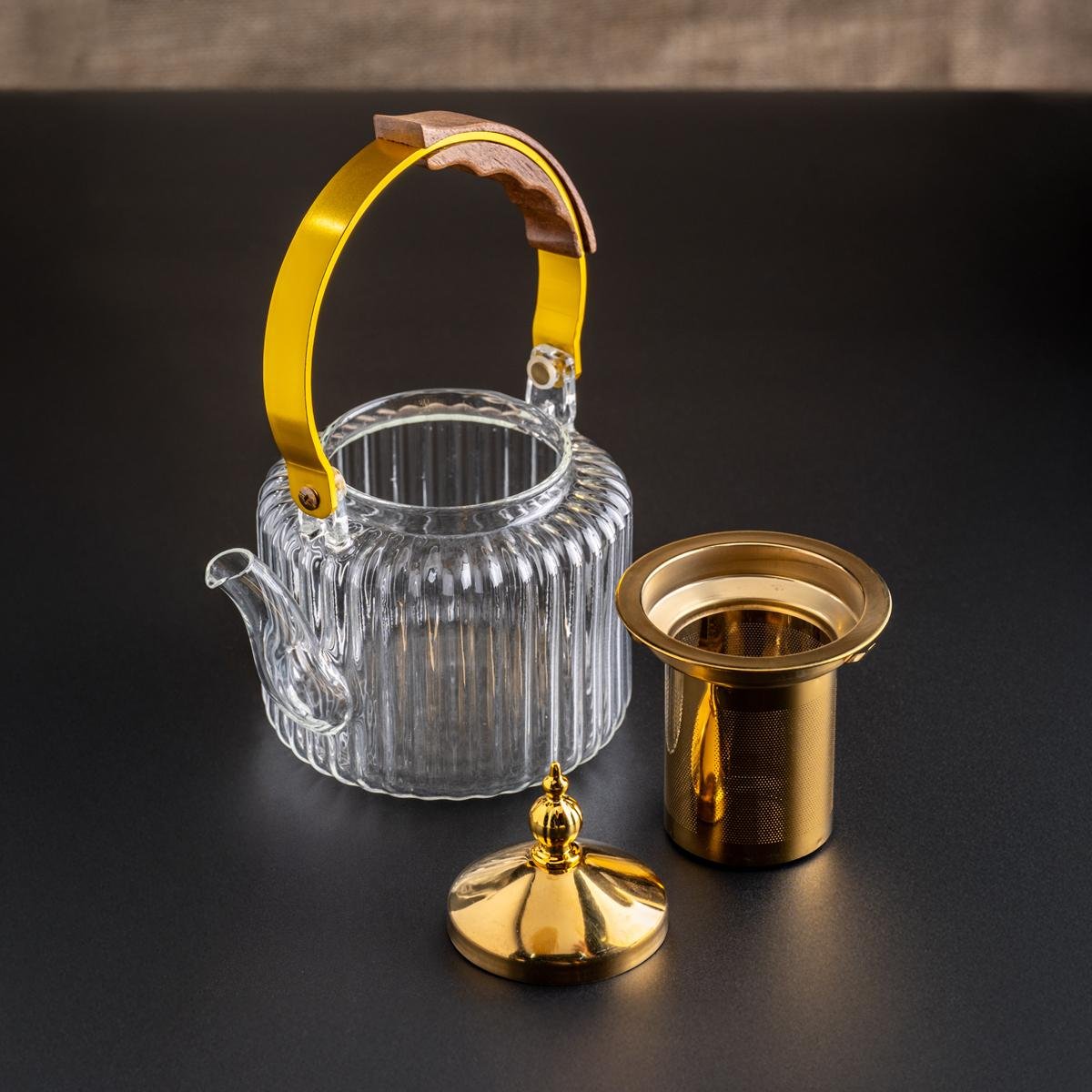 إبريق شاي زجاجي فاخر مع لمسات ذهبية ومقبض خشبي – تجربة تخمير شاي أنيقة