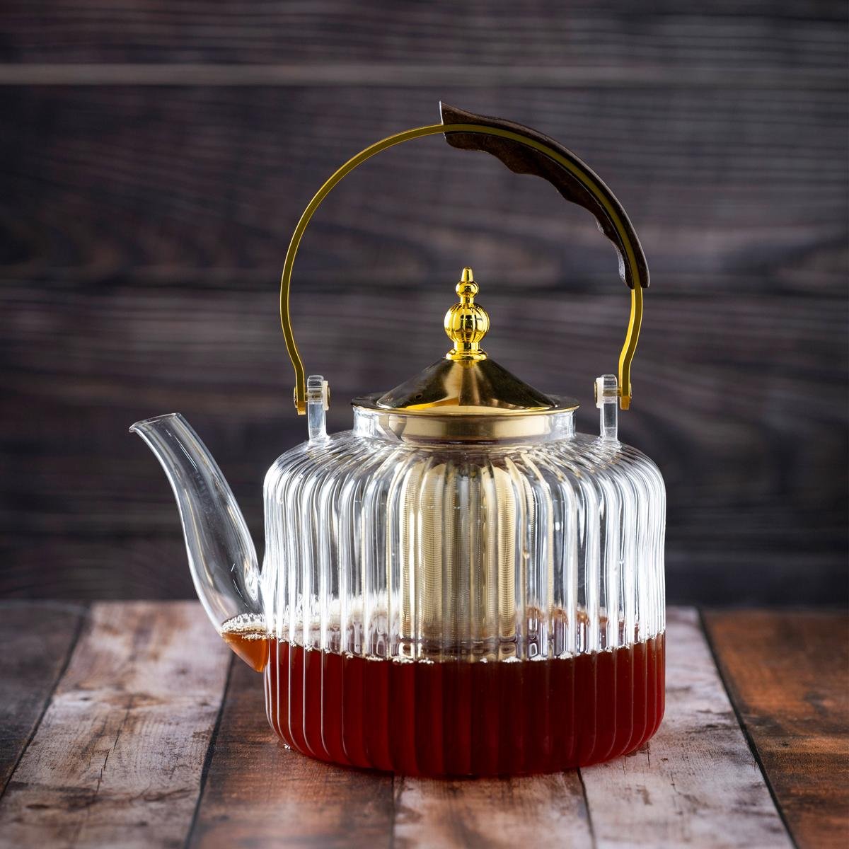 استمتعي بإبريق الشاي الزجاجي الفاخر، الذي يتميز بتصميم متموج فريد، ولمسات ذهبية أنيقة، ومقبض خشبي مريح يمنحك إحساسًا بالدفء والفخامة.