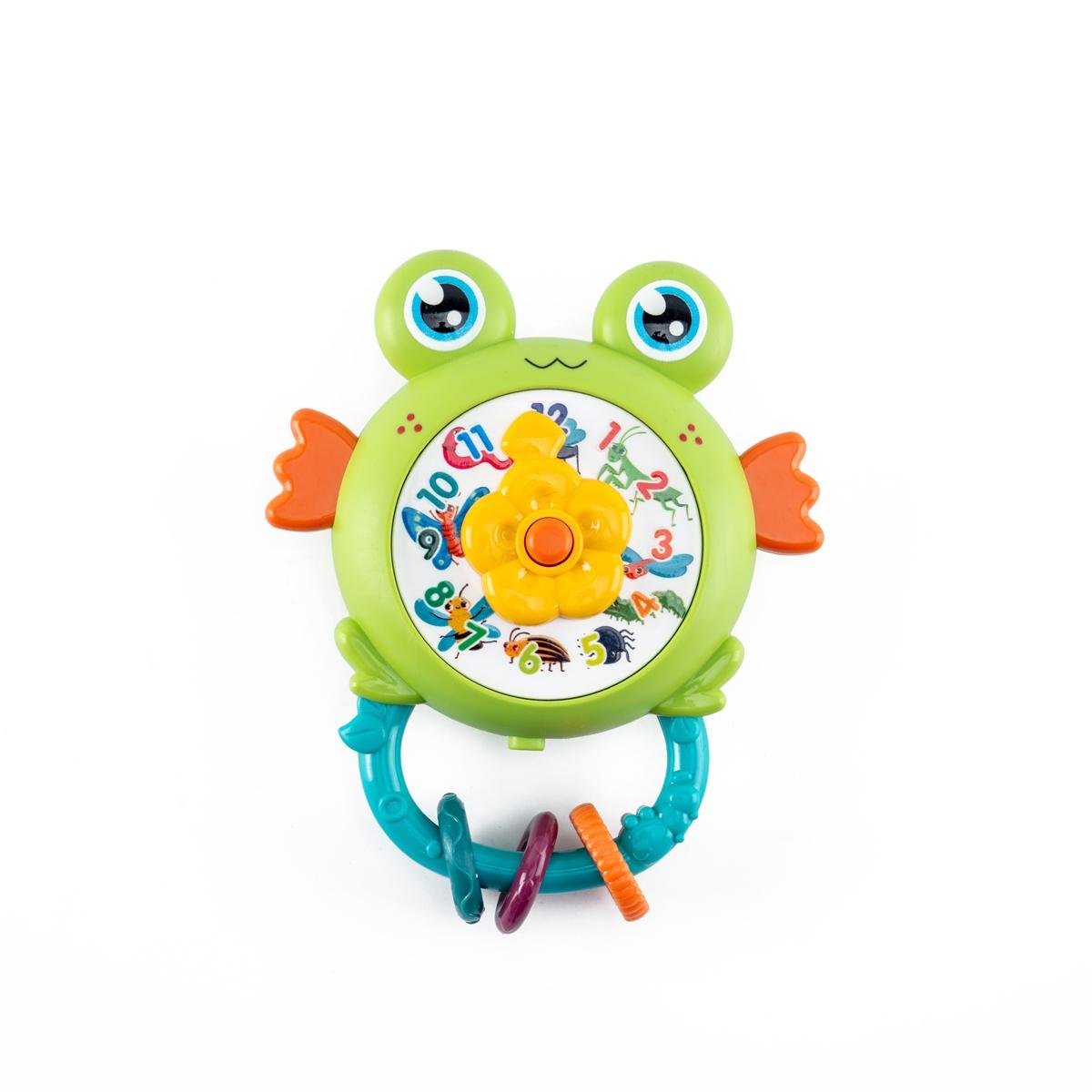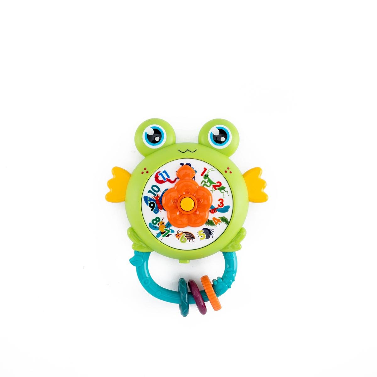 لعبة الخشخيشة الموسيقية على شكل ضفدع مع تصميم ساعة