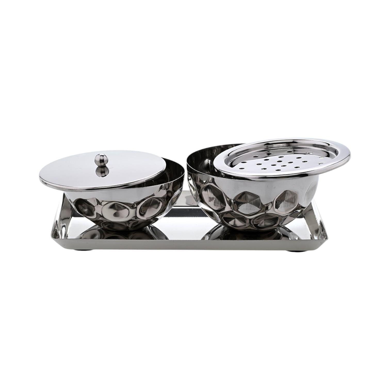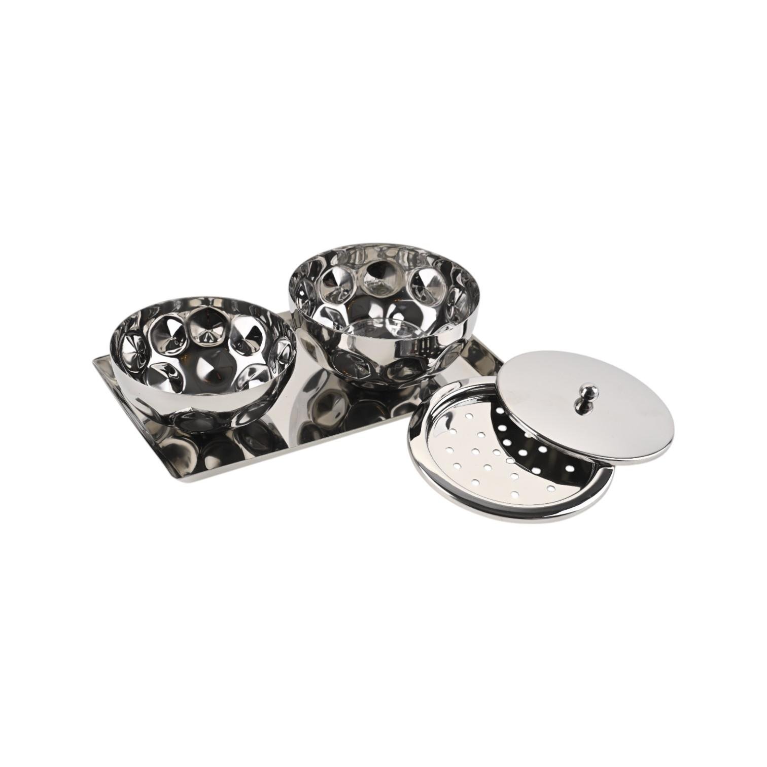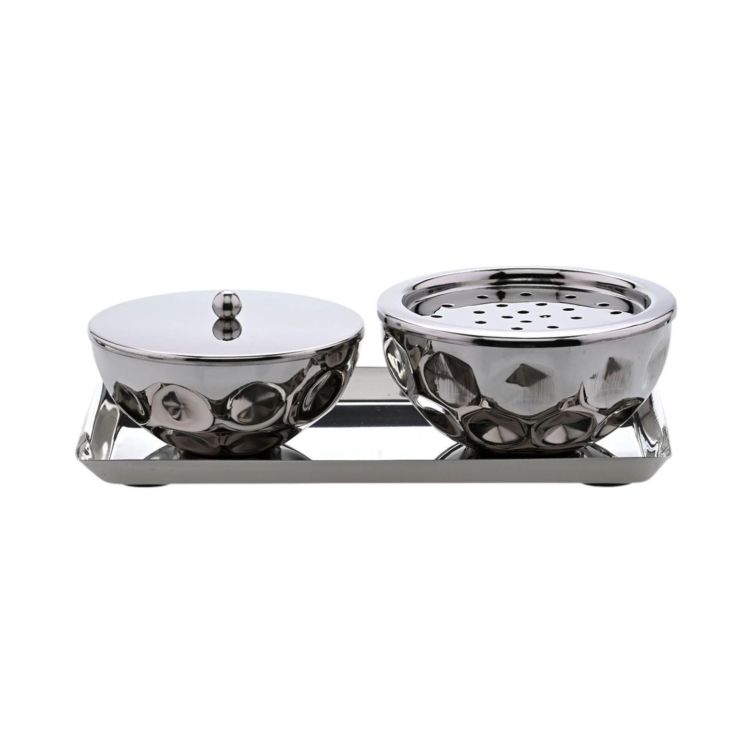 ارتقِ بأجواء منزلك مع طقم المبخرة الأنيقة من الستانليس ستيلالمقاوم للصدأ، مصممة بشكل جميل ومكونه من وعاءين مزخرفين، تنشر الروائح الرائعة في منزلك بشكل مثالي. مصنوعة من الستانليس ستيلالمقاوم للصدأ عالي الجودة، وتتميز بنمط هندسي فريد يضيف لمسة من الأناقة إلى أي غرفة. تتضمن المجموعة وعاءين: واحد بغطاء لحفظ البخور وآخر بغطاء مثقوب للتبخير بشكل مثالي. تضمن الصينية المتينة الاستقرار وسهولة التعامل. مثالية للتبخير، وجلسات التأمل، أو ببساطة كعنصر زخرفي في منزلك