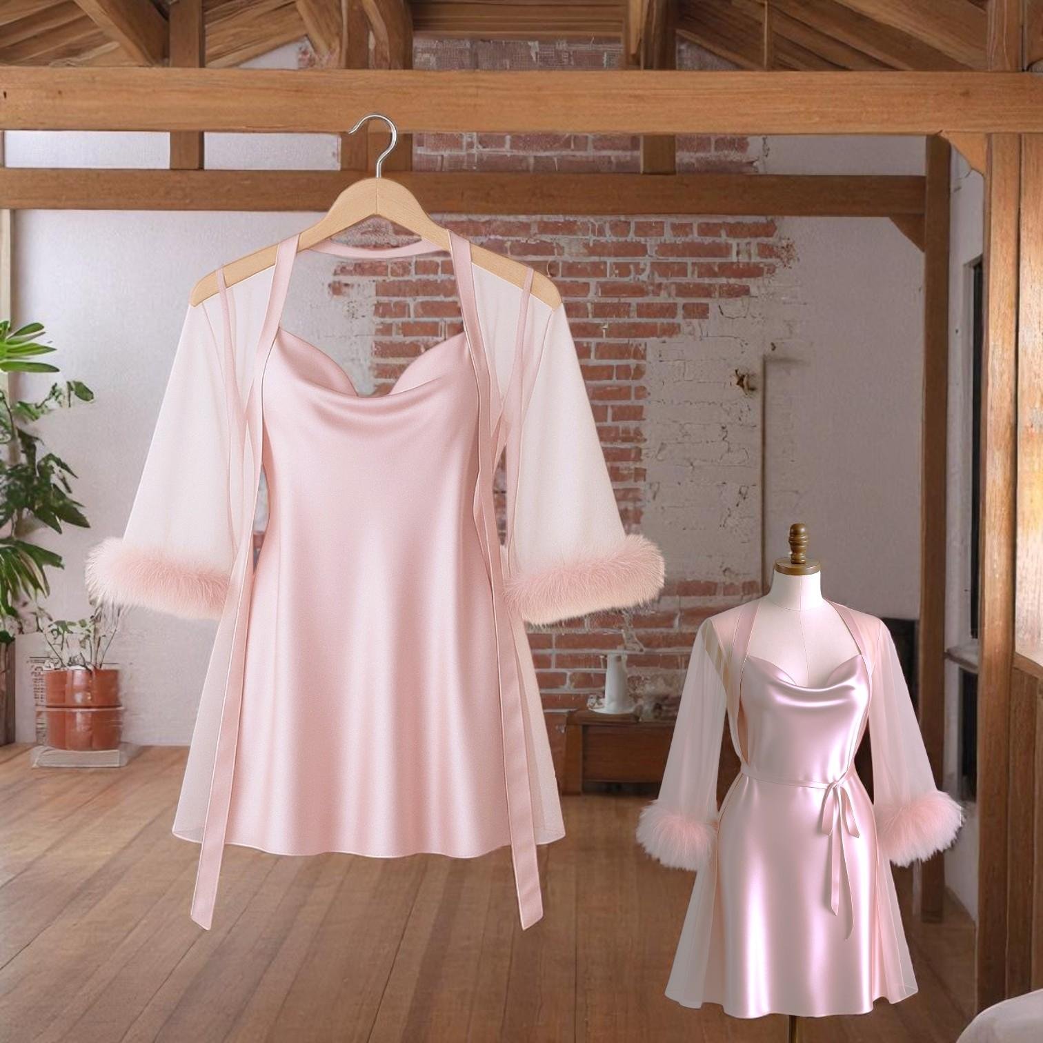 امنحي نفسك لمسة من الفخامة مع طقم فستان ساتان مع رداء شبكي فاخر وأساور فرو صناعي. يتميز الرداء الشبكي الشفاف بأساور من الفرو الصناعي تضيف لمسة راقية، بينما يمنح الفستان المصنوع من الساتان الناعم إطلالة جذابة ومريحة. سواء كنت تستمتعين بلحظات هادئة أو تبحثين عن تألق خاص، هذا الطقم يجمع بين الأناقة والراحة في تصميم واحد مميز.