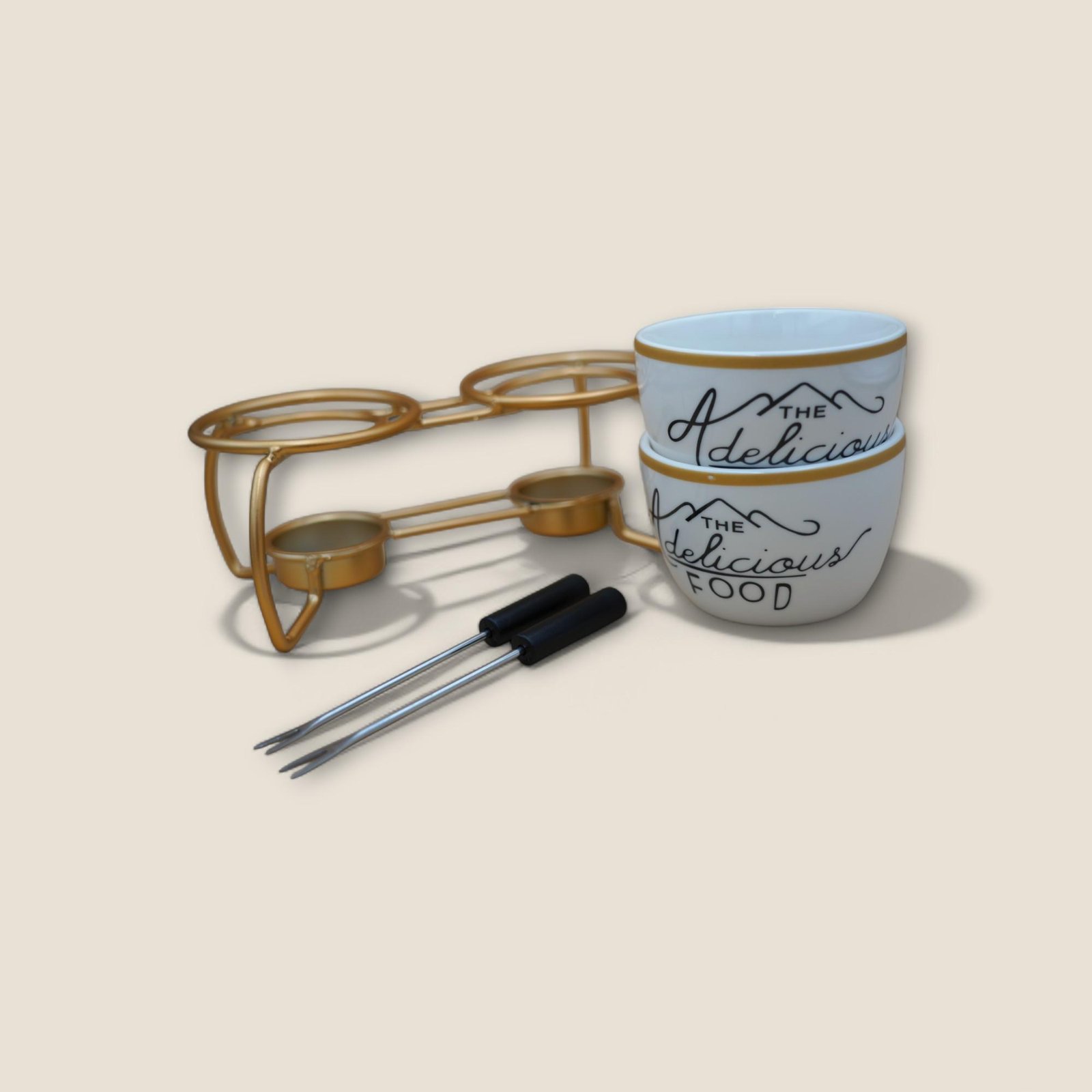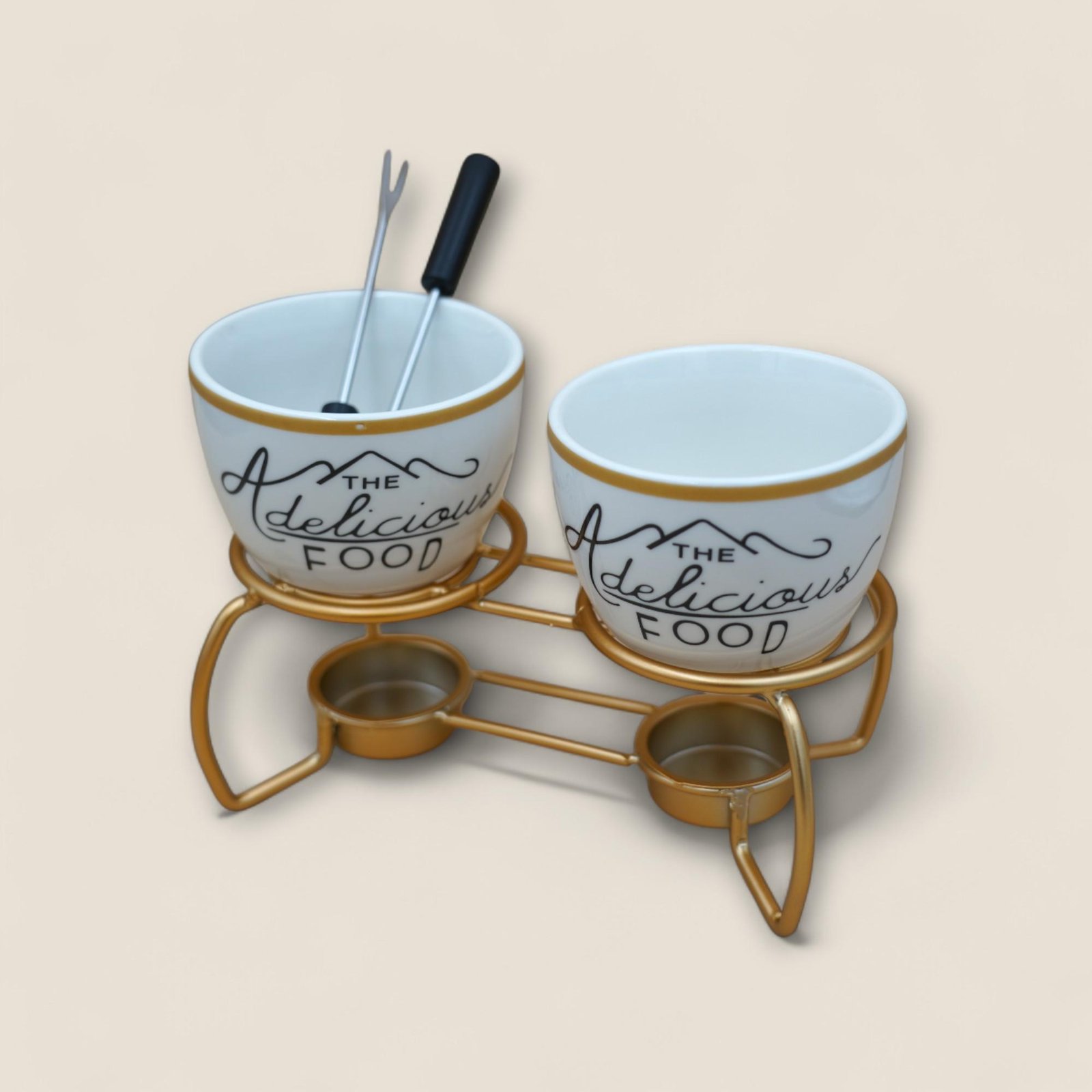 Specifications Value Features Dimensions: 19x12.5 cm - Set Includes:2x Ceramic fondue bowls with “The Delicious Food” printed design-1x Metal stand in gold finish with two integrated tealight holders-2x Stainless steel fondue forks with heat-resistant black handles