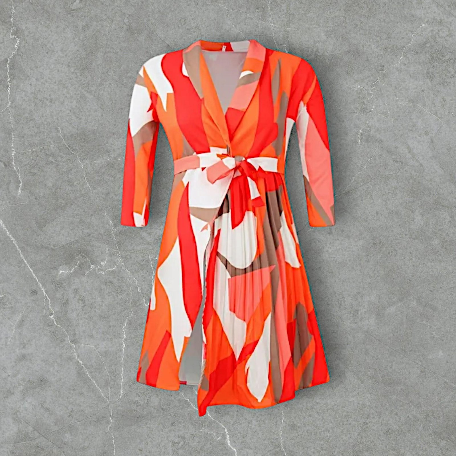 Add a touch of casual elegance to your look with this unique wrap dress with abstract print. Features a classic, elegant collar, soft pleats that add feminine movement, and a waist belt to adjust the fit to your liking. Its design makes it an ideal choice for daily outings or special evenings