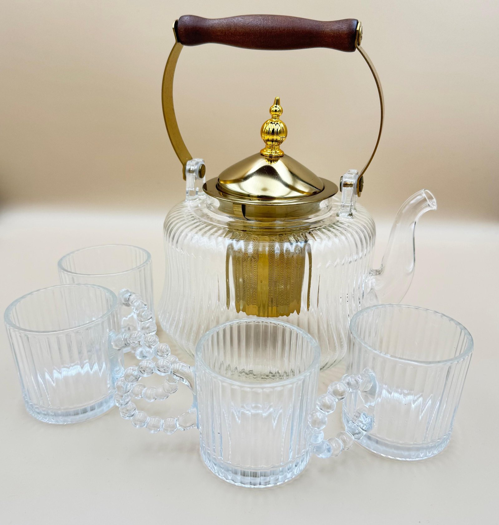 Crystal Tea Set with Gold Lid, Wooden Handle and Beaded Cups (Set of 5) Enjoy luxury with this exquisite 5-piece crystal tea set, featuring a gold lid and carefully designed wooden handle. With four beaded cups that add a touch of beauty to any tea session, this set makes every sip a unique experience