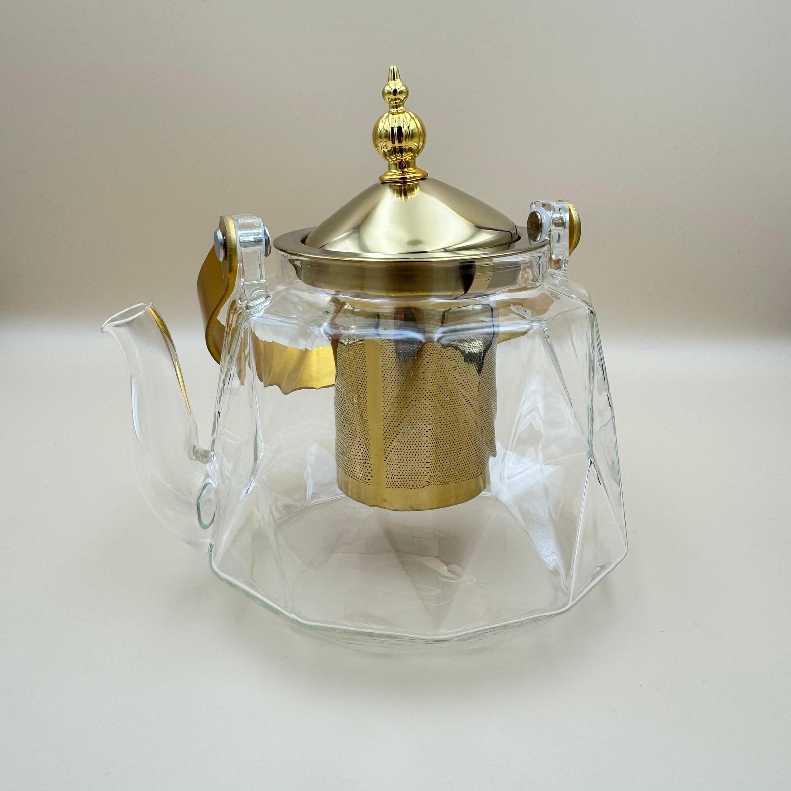 For tea lovers, this teapot is designed for you in every detail, with a diamond-designed glass teapot, a golden lid with a strainer and a decorative handle.