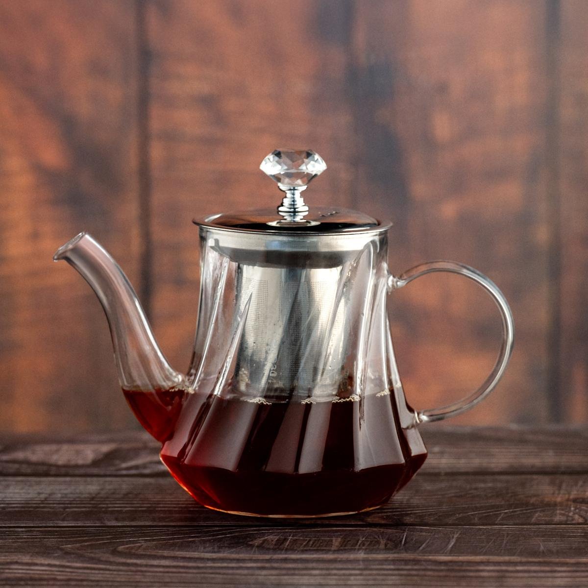 | الوصف | إبريق شاي زجاجي مع مصفاة من الستانلس ستيل ومقبض كريستالي. |