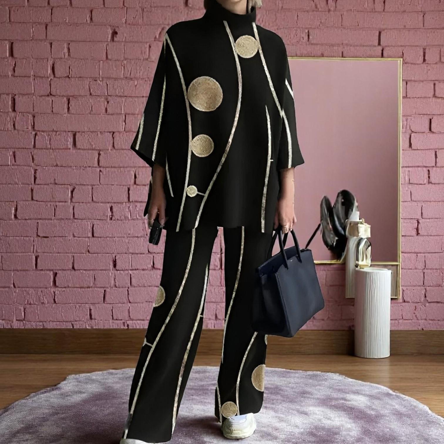 Distinguish yourself with a look that combines elegance and comfort because you deserve the best with a wide tunic and wide pants set printed with geometric lines and dots