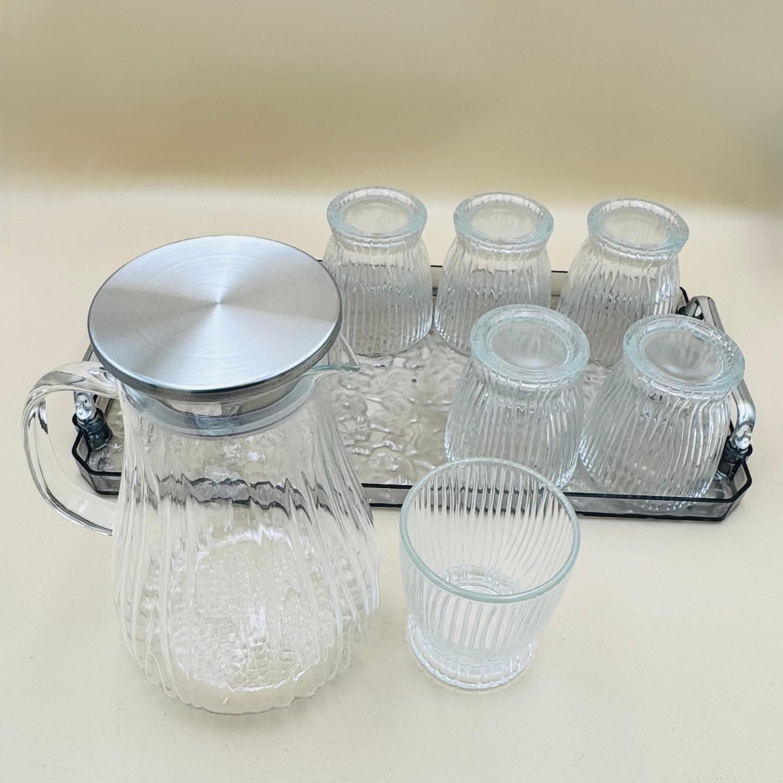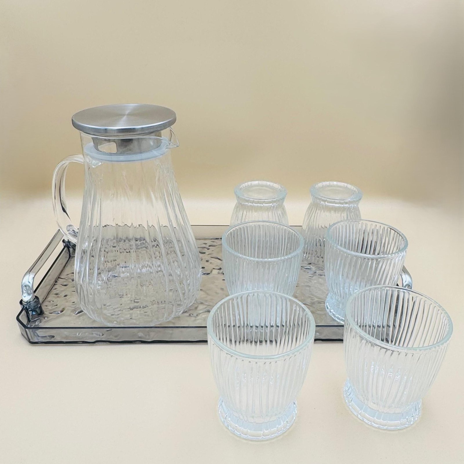 Add a touch of elegance to your table with this glass set designed for beauty. The set includes an elegant carafe, six matching cups, and a versatile serving tray, perfect for serving refreshing beverages at family get-togethers, gatherings, or even just a relaxing time