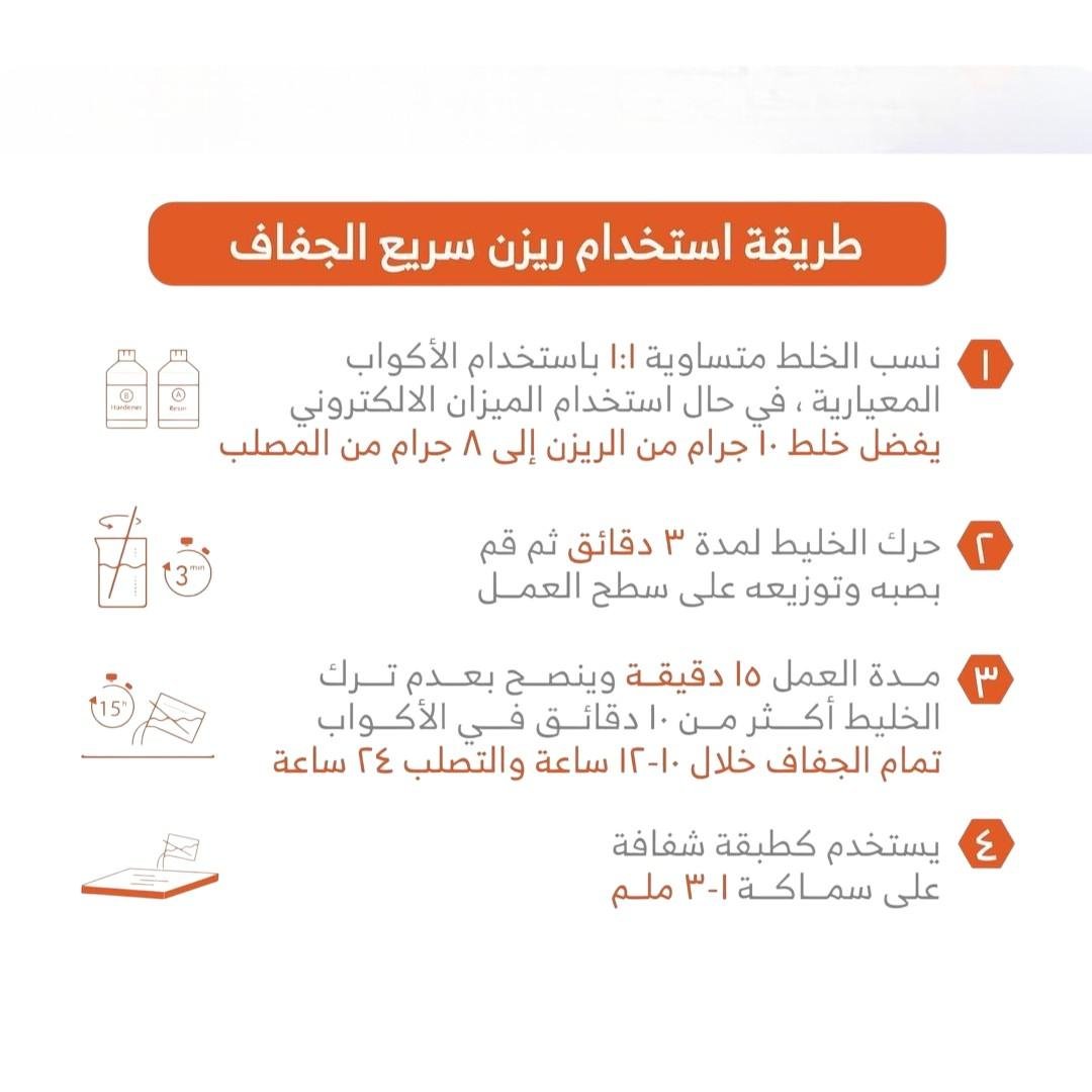 Using a measuring cup, mix 10 parts of resin with 10 parts of hardener by weight. Stir gently until both components are fully blended. Add resin colors or any other desired additives. Pour the mixture onto the surface or silicone mold. Remove air bubbles after 5–10 minutes using a bubble remover. Leave the resin to dry completely away from sunlight, dust, or open areas to prevent any particles from sticking to the work.