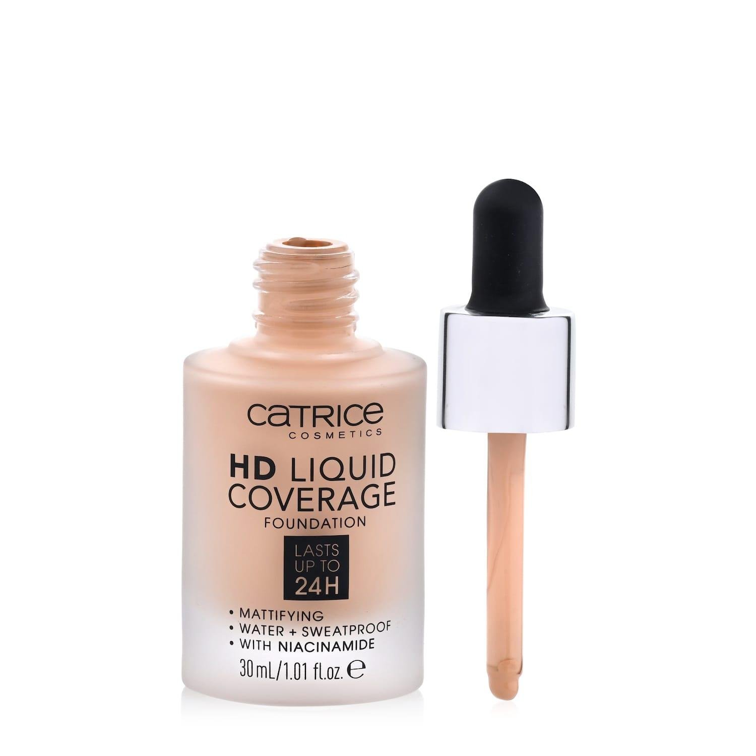 Achieve a flawless, velvety-matte complexion with Catrice’s HD Liquid Coverage Foundation in shade 046 Camel Beige.