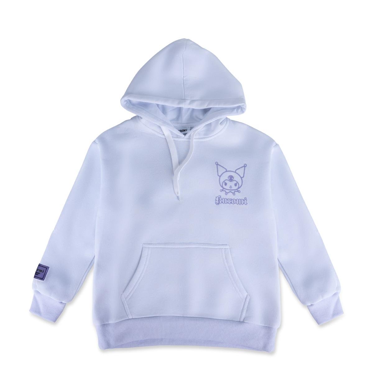 Wrap yourself in the adorable charm of Kuromi with this white hoodie, perfect for fans of the mischievous Sanrio character.