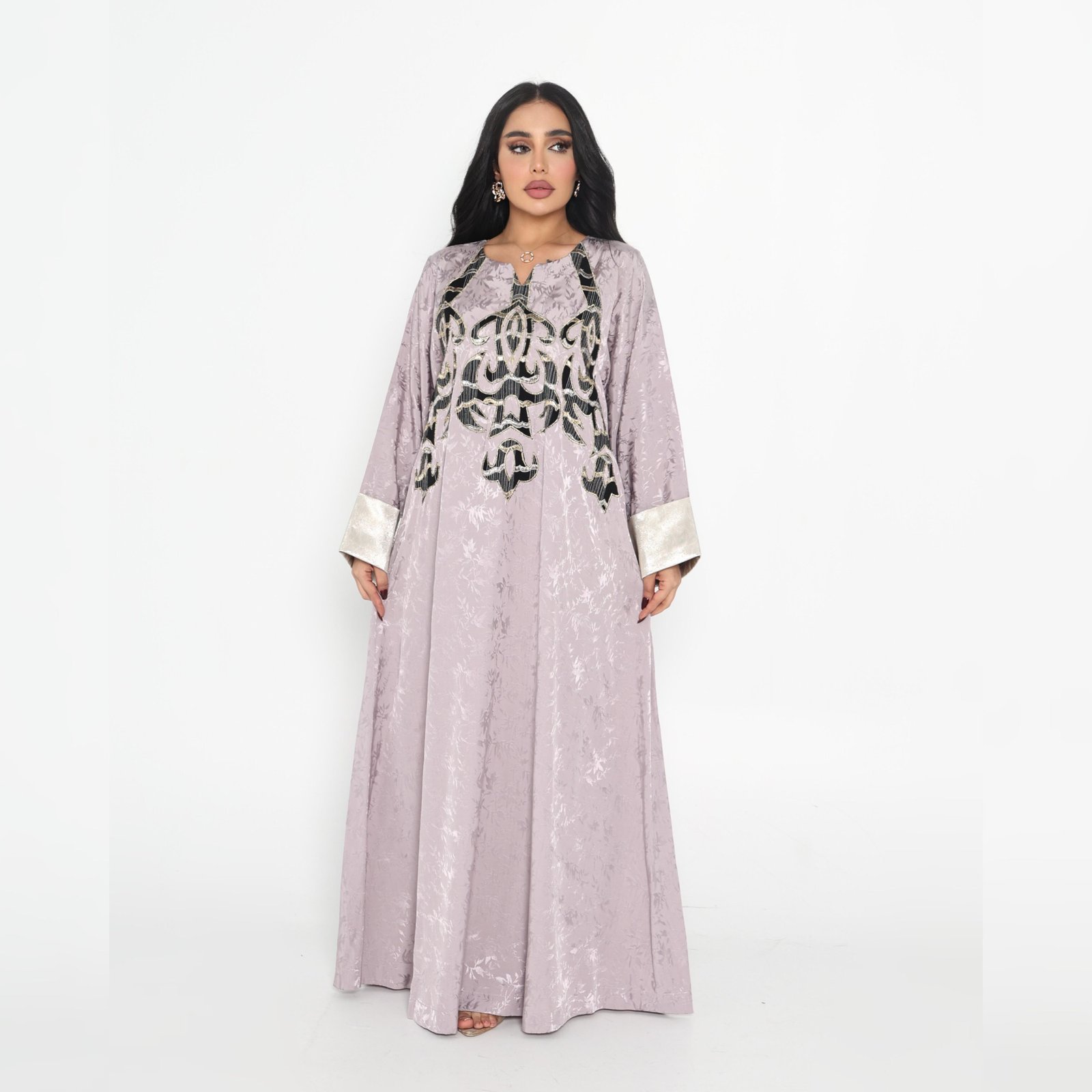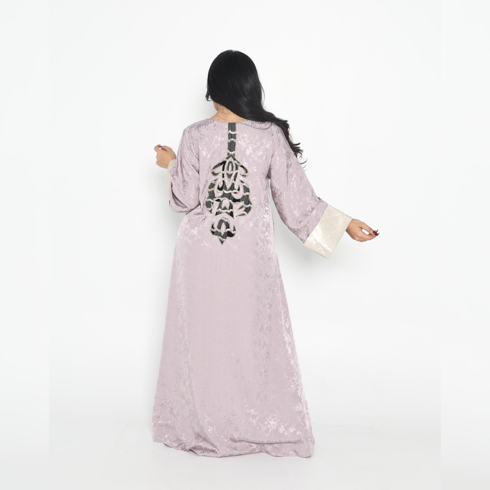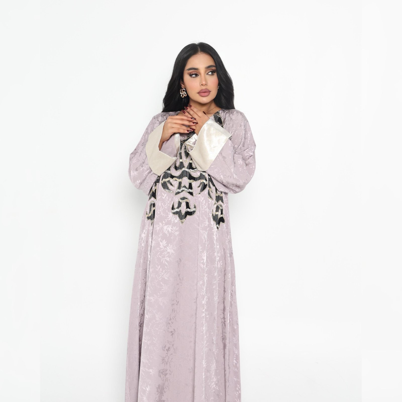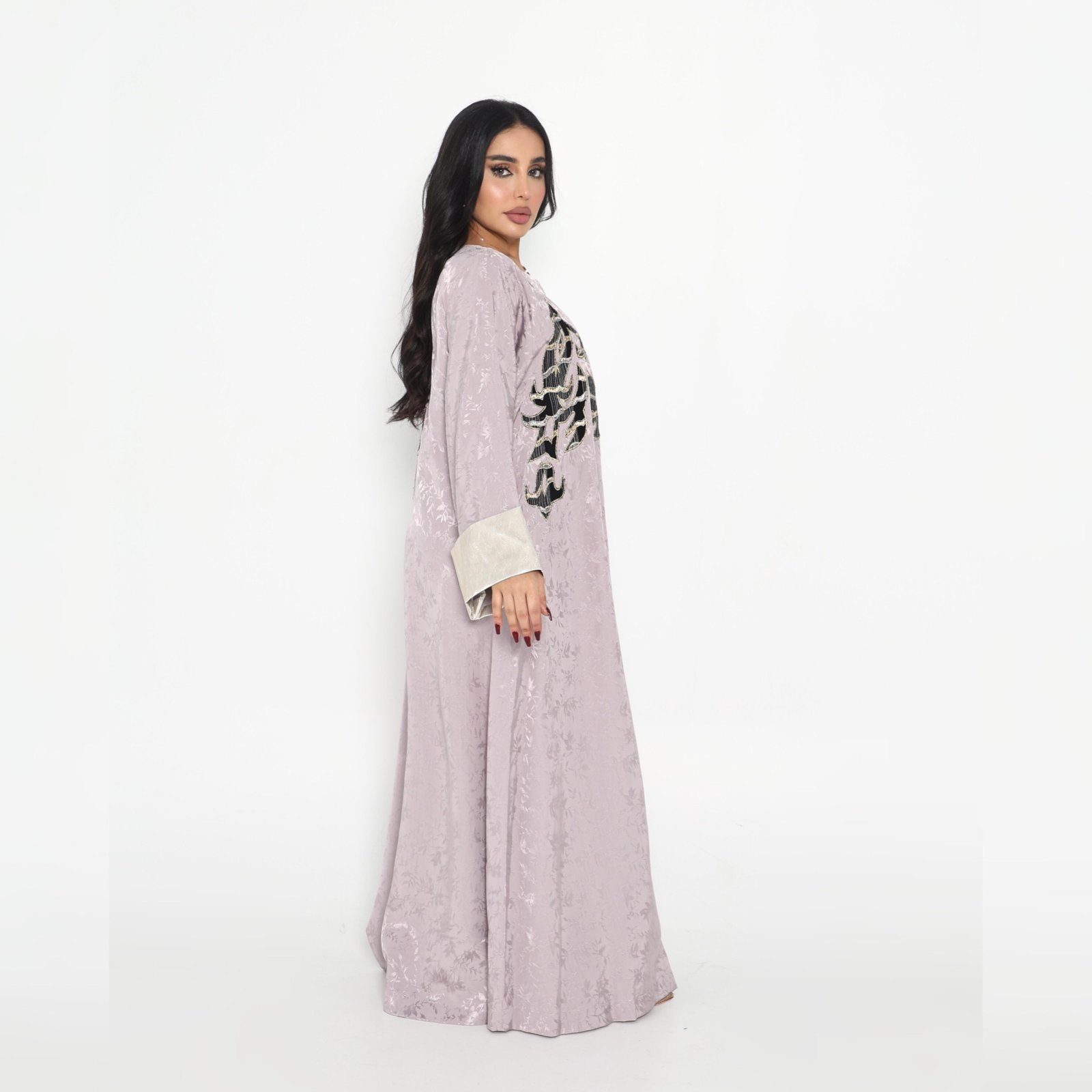 This piece will be a wardrobe staple. Elegance with a touch of elegance with this purple kaftan embroidered with metallic touches and satin sleeves