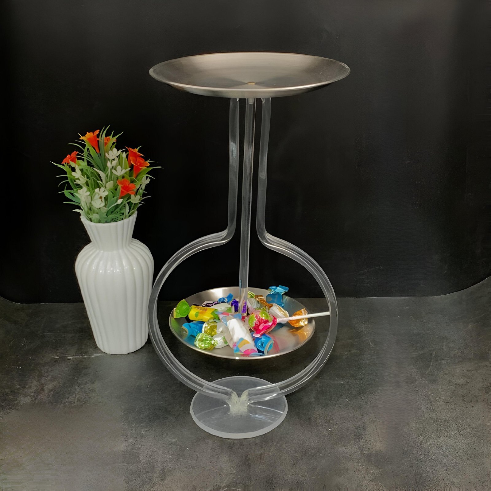 Add a touch of elegance to your table with this modern 2-tier acrylic serving tray. With its modern circular design and shiny silver finish, it is perfect for serving drinks, snacks, desserts, or even as an elegant centerpiece for your table decor. Whether you are receiving guests or just want to organize your day more beautifully, this tray combines beauty and elegance