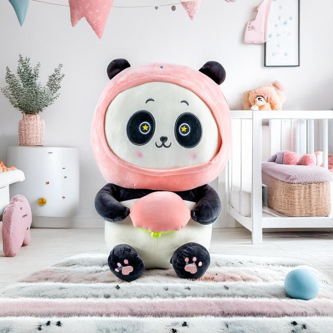 This adorable panda is dressed in a cozy peach-colored hoodie with cute bear ears, combining style and snuggly comfort in one. Whether it's nap time, playtime, or room décor, this plush friend is perfect for kids and panda lovers alike. Its gentle texture and friendly face make it an irresistible gift for birthdays or just because.