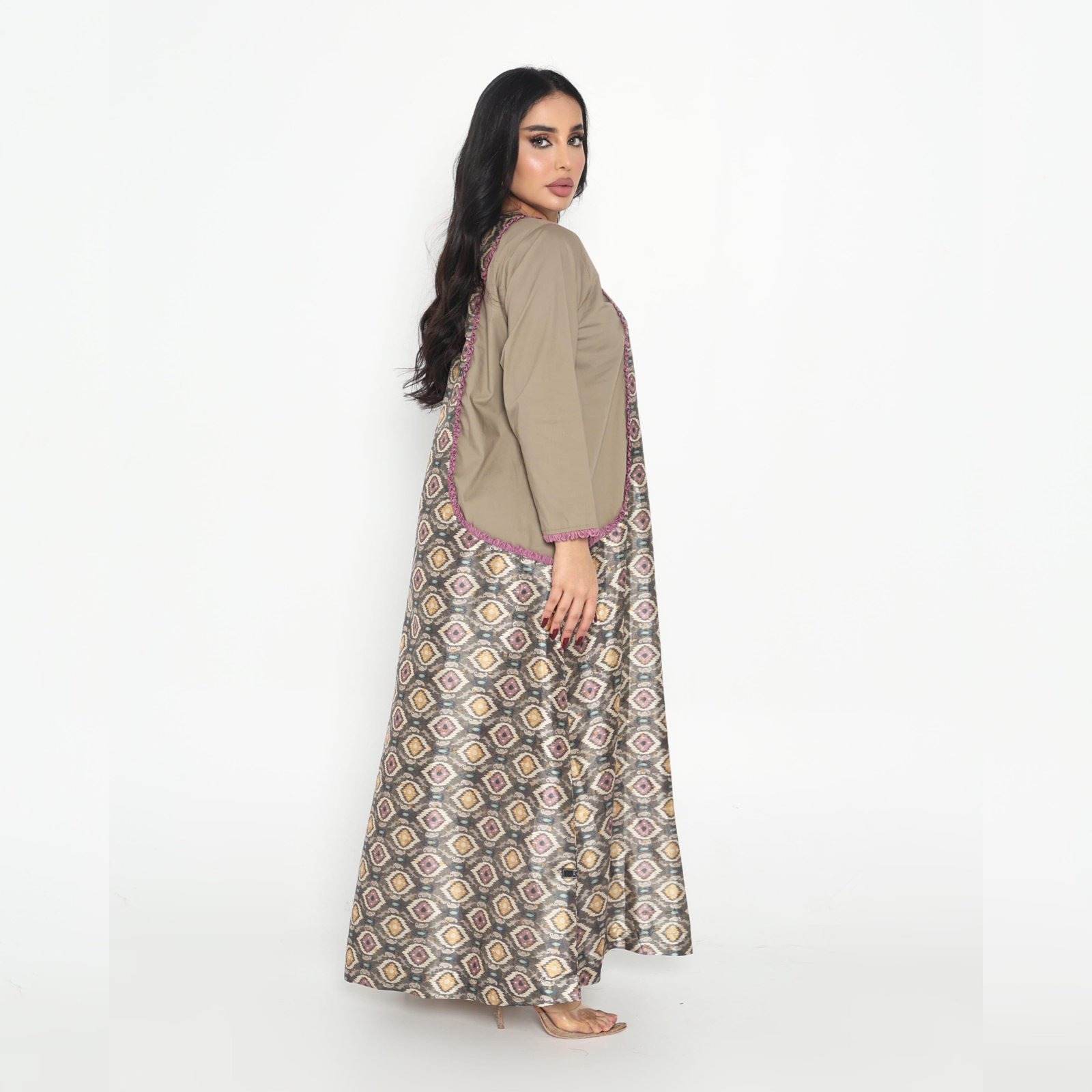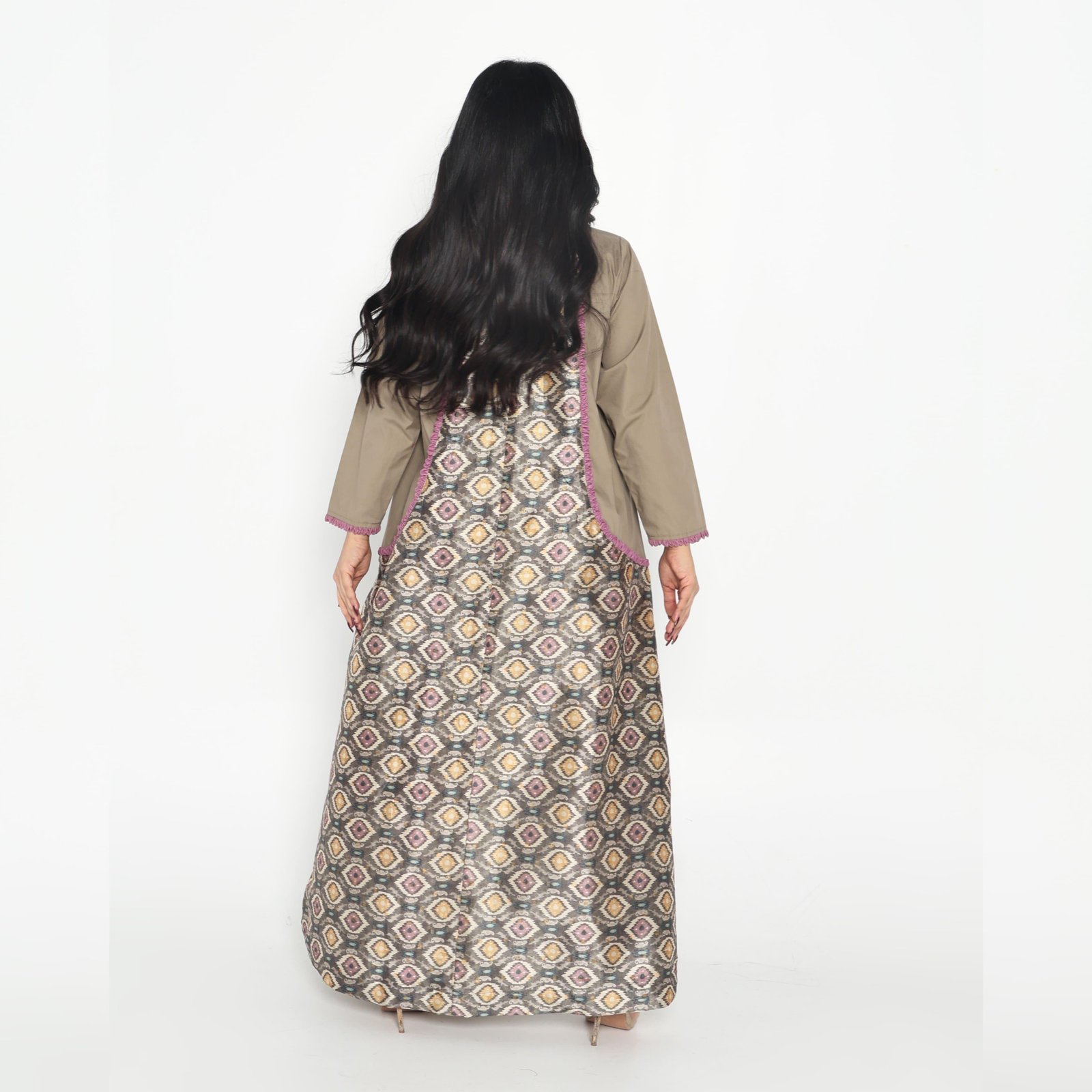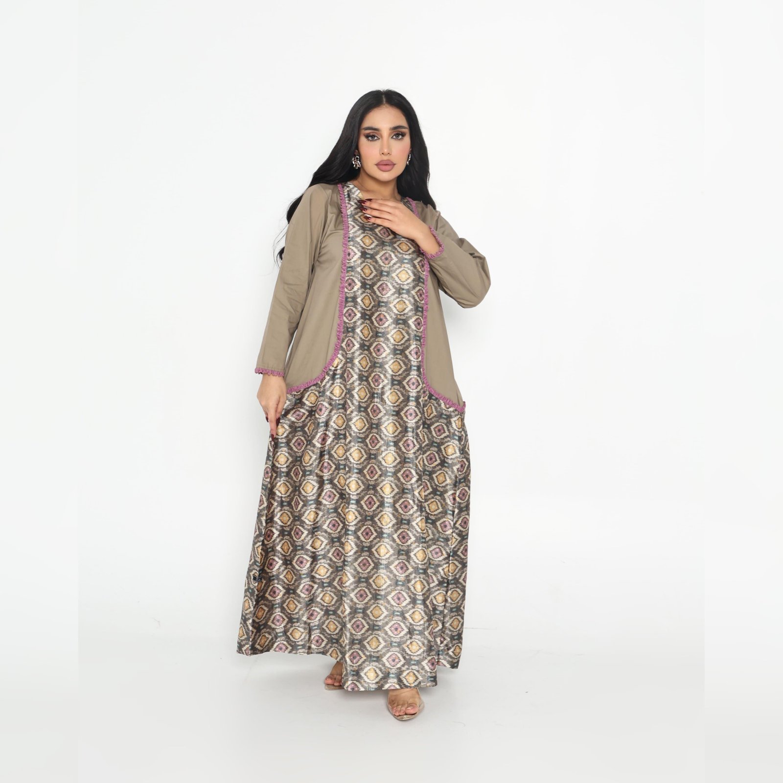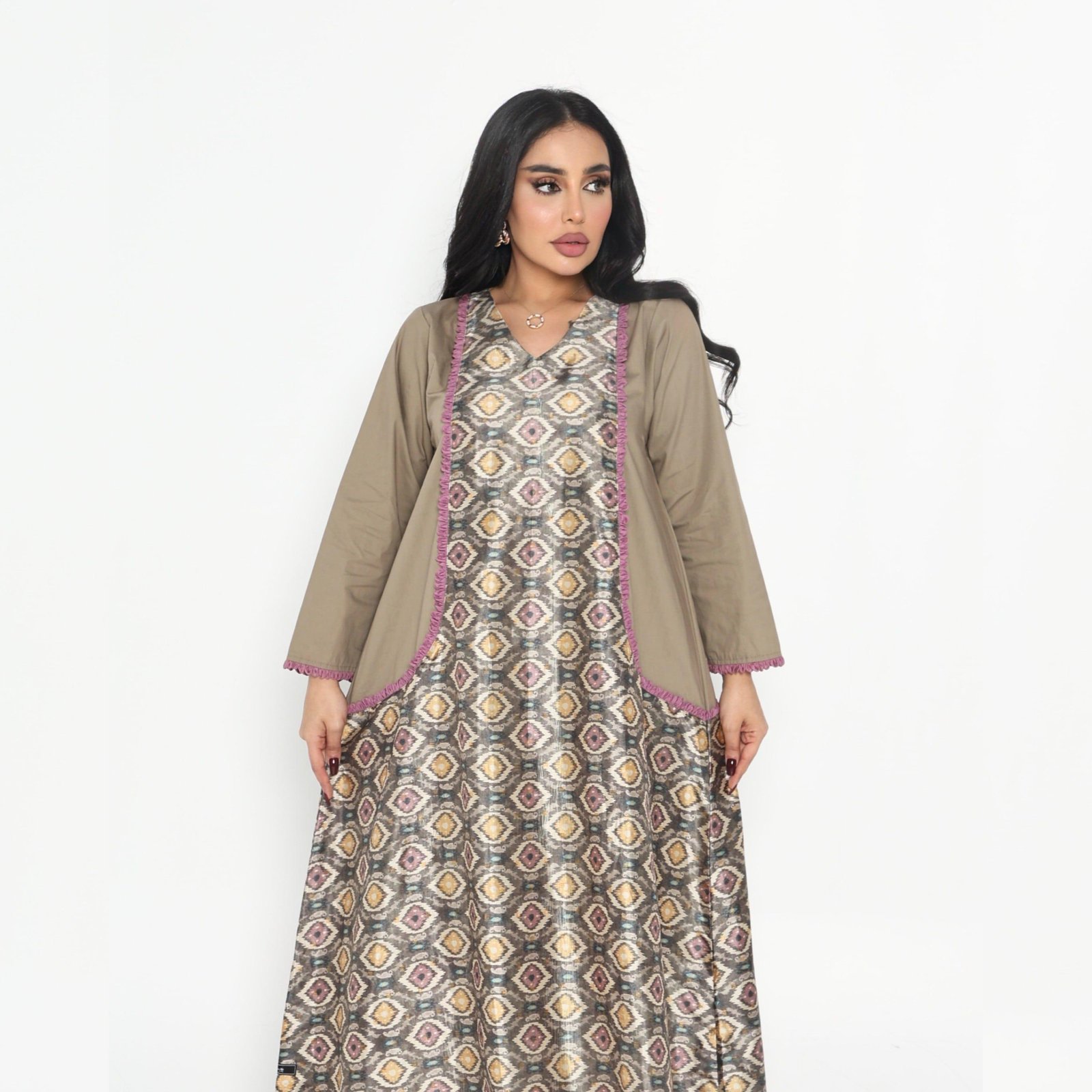 Distinguish yourself with an elegant look that resembles no one else with an open abaya and a printed satin top with olive and mauve border details.