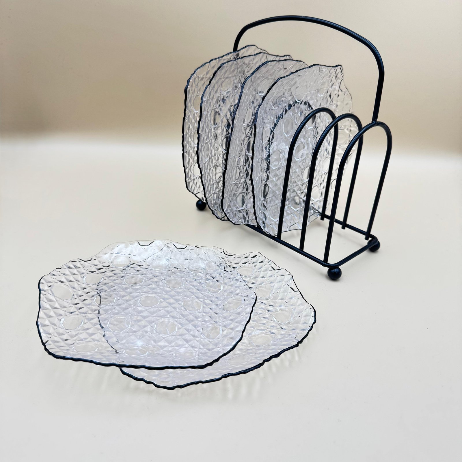 Refresh your table with a set of glass plates with a distinctive texture, elegantly designed with a modern stand for elegant storage. Perfect for everyday use or special occasions, these durable plates combine modern design with practical functionality. Subtle patterns add a touch of luxury, while the included stand helps you organize your dishes with ease