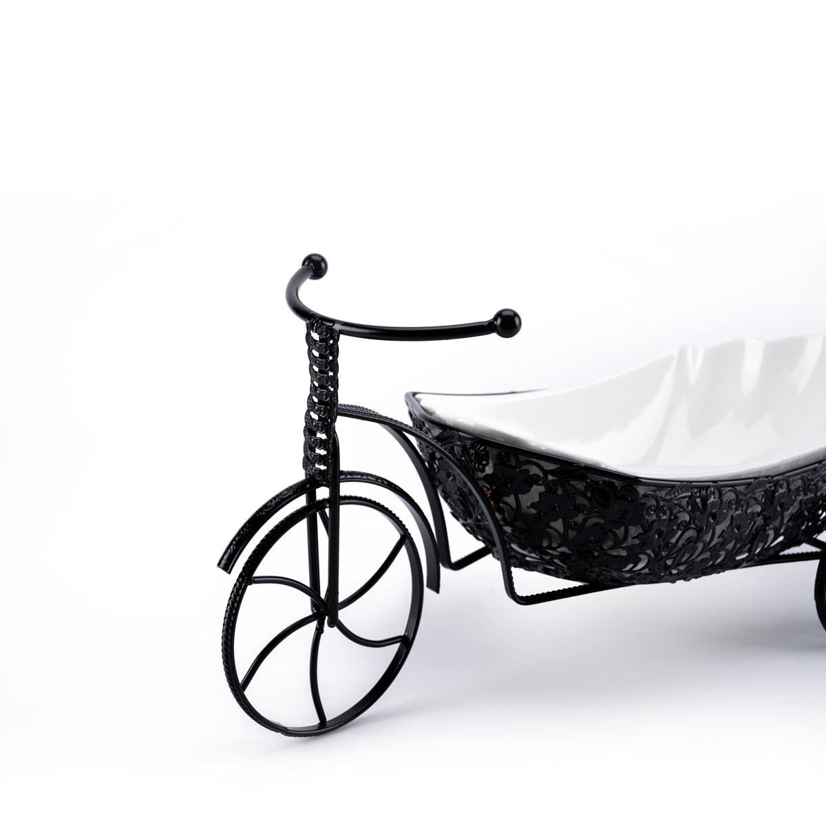تجمع هذه الصينية بين الوظيفة والجمال بتصميم فريد، حيث تأتي بوعاء بورسلين عميق ومثالي لحفظ الفواكه، الوجبات الخفيفة، أو الإكسسوارات الزخرفية. توفر القاعدة الحديدية السوداء بتصميم العربة ثباتًا قويًا وتضفي لمسة راقية على الديكور