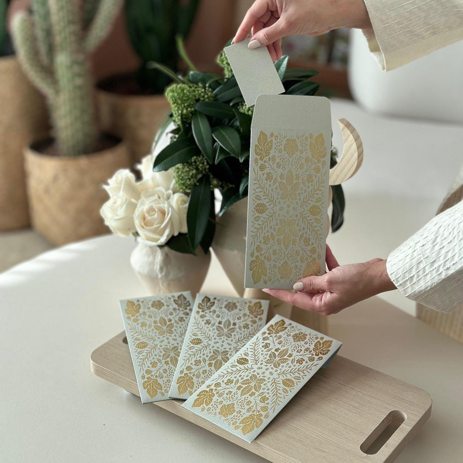 يتميز هذا الطقم الفاخر بأظرف مصنوعة من ورق فاخر مزين بنقوش نباتية رائعة مضغوطة باللون الذهبي، مما يضفي إشراقة وأناقة راقية على أي مناسبة.