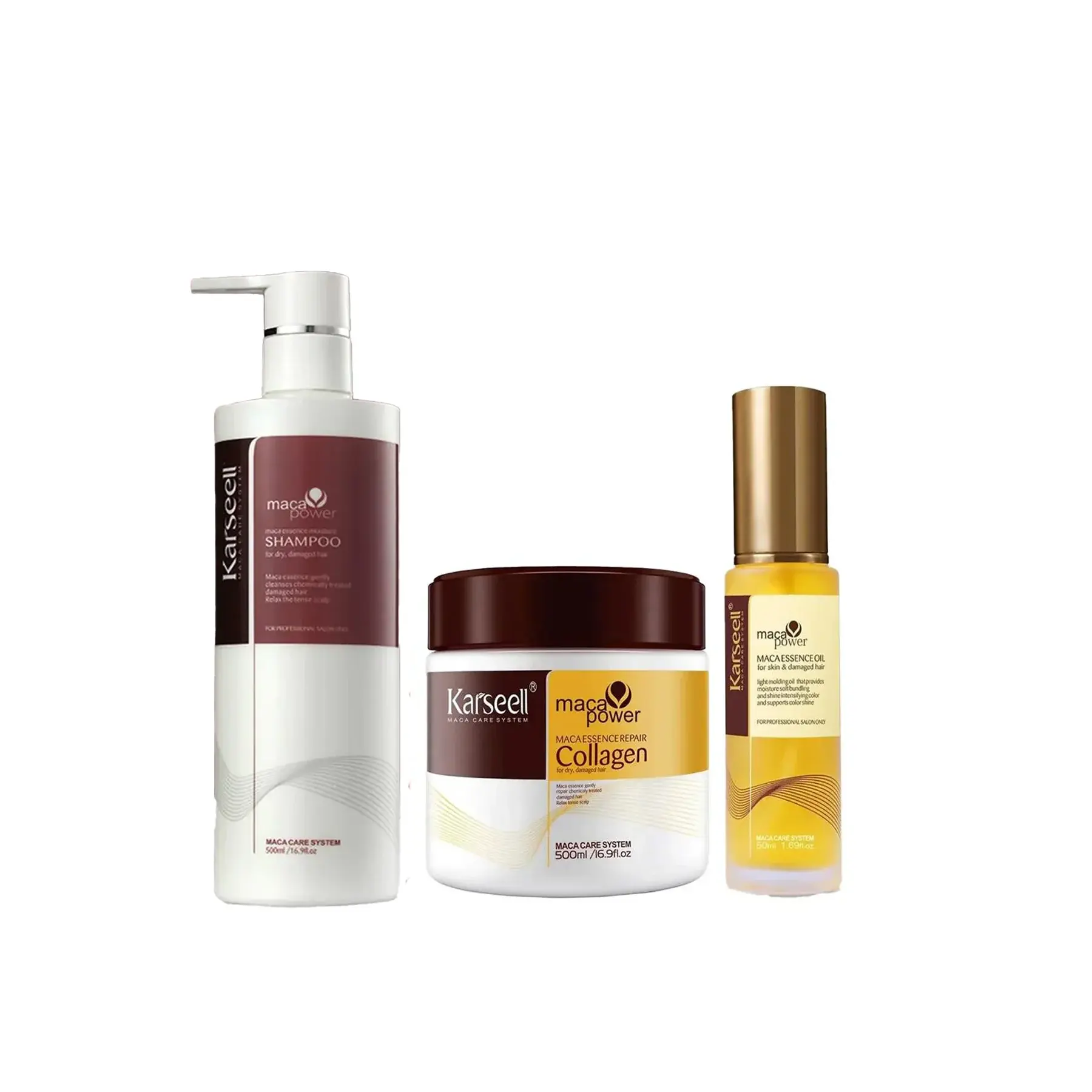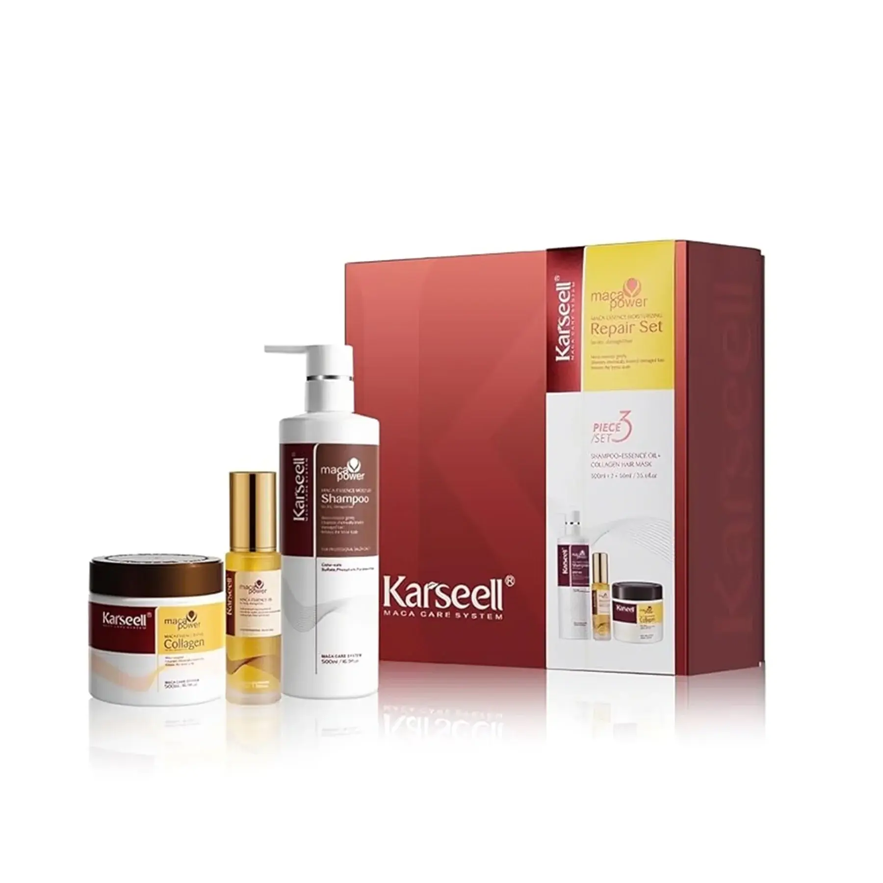 توفر مجموعة كارسيل ماكا إيسينس للترطيب والإصلاح الحل المثالي لإصلاح الشعر التالف والجاف من خلال نظام متكامل من 3 خطوات، يجمع بين الكولاجين، خلاصة الماكا، وزيت الأرجان لاستعادة صحة الشعر، تقويته، وترطيبه بعمق.