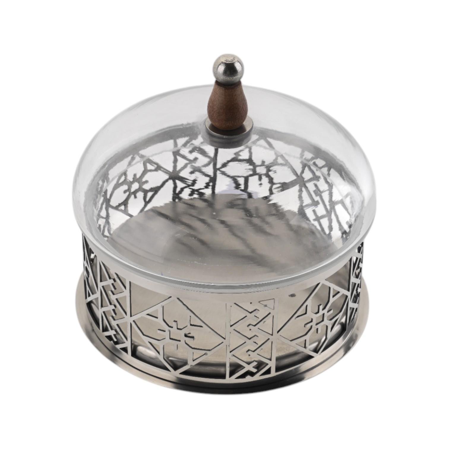 وعاء الحلويات والتمر المقطوع بالليزر مع غطاء زجاجي عملي وأنيق بتصميم فاخر. صُمم ليكون إضافة مميزة لأي مناسبة، مثالي لتقديم الحلويات والتمر بأسلوب راقٍ وجذاب. يحافظ على محتوياته طازجة مع إتاحة رؤيتها لتضفي مزيد من الحيوية. تصميمه الفاخر يجعل منه قطعة جذابة تضيف لمسة من الرقي إلى ديكور منزلك. وعاء الحلويات المثالي لمن يبحث عن الجمع بين الجمال والعراقة.