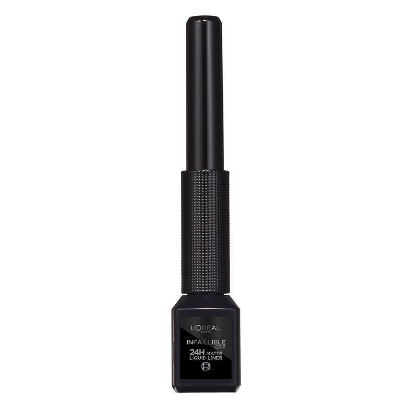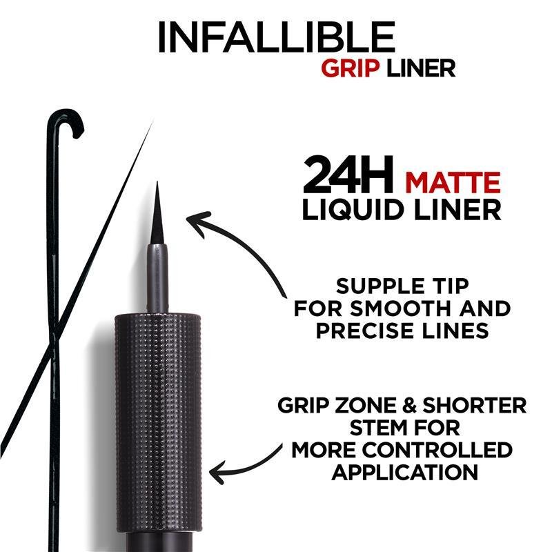 اكتشفي فن تحديد العيون المثالي مع قلم تحديد العيون السائل غير اللامع من لوريال باريس إنفاليبل جريب 24 ساعة في اللون الأسود 01.