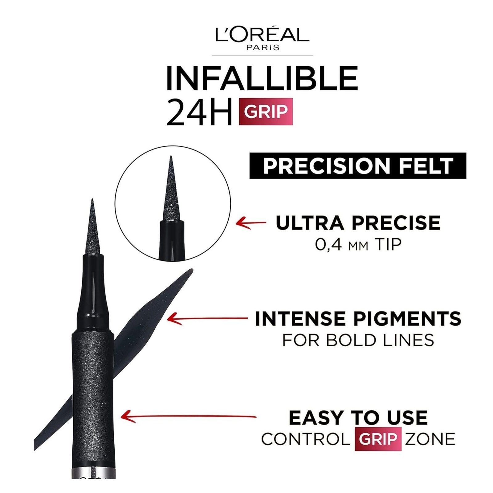 احصلي على تحديد مثالي لعينيكِ مع لوريال باريس إنفاليبل جريب آيلاينر فيلت مقاوم للماء باللون الأسود.